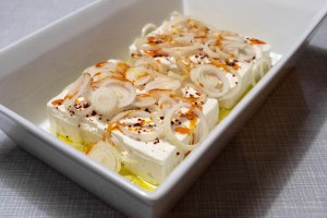 Die Feta- (oder Schafskäse-) Stücke mit Olivenöl benetzen und in eine Auflaufform geben. Die Zwiebel in Ringe oder Streifen schneiden und darüber geben. Ebenso entweder die in Streifen geschnittene frische Chili oder Chiliflocken. Mit weiterem Olivenöl beträufeln und ggf. noch etwas Chiliöl dazugeben.