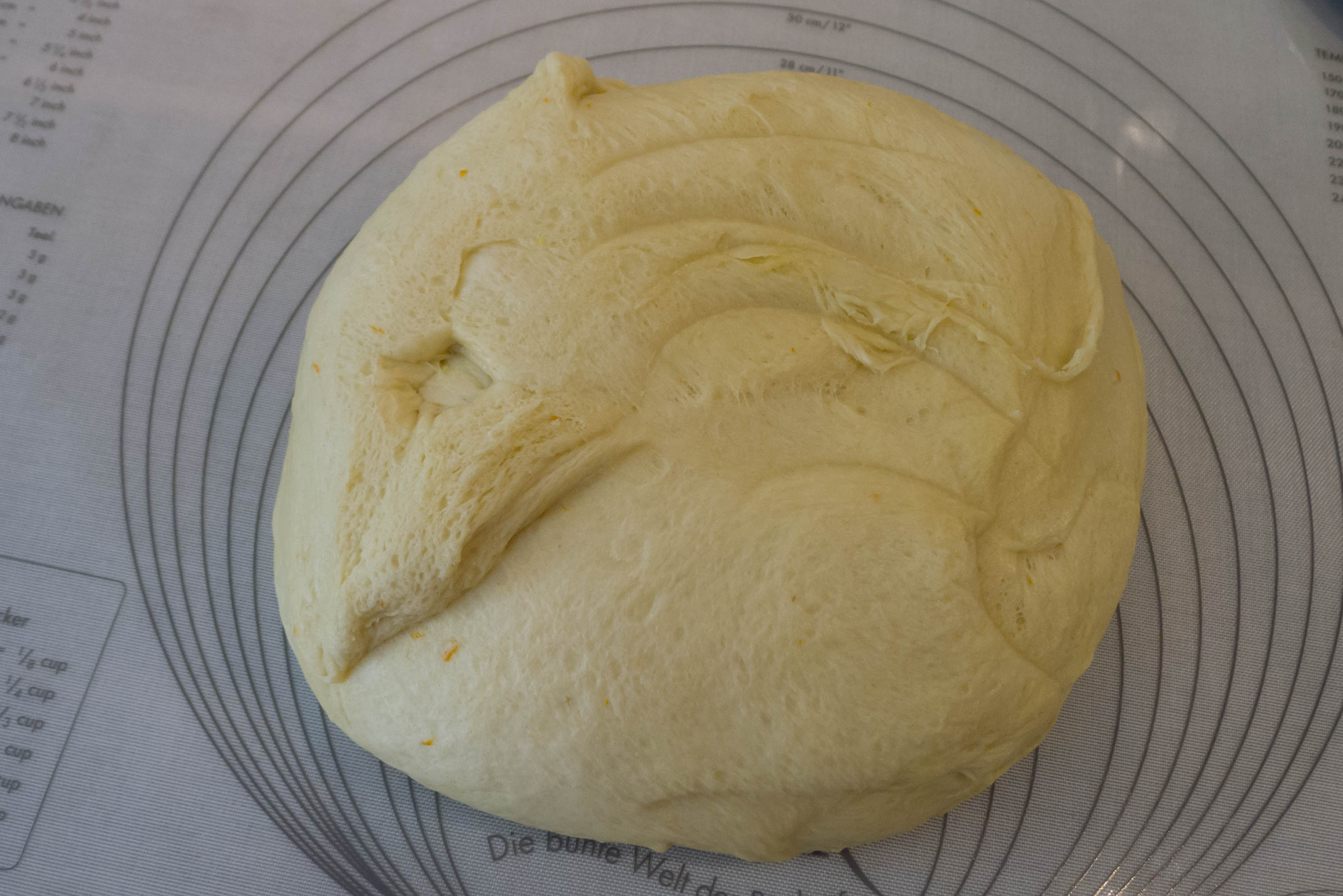 Benötigt werden neben der bereits genannten Butter: Milch, Hefe, 120 g Zucker, Orangen- und Zitronenzeste, Honig, Vanilleextrakt, Salz, Eier, Orangensaft, ca. 650 g Mehl. Die Milch auf etwa 35°C anwärmen und in einer Schüssel mit der Hefe und 1 EL Zucker vermischen. Für etwa 10 Minuten stehen lassen: wenn die Hefe triebstark genug ist, wird sich in dieser Zeit eine kräftige Schaumhaube bilden – falls dieses nicht passiert, mit anderer Hefe einen erneuten Versuch starten. In der Zwischenzeit die Orangen- und Zitronenzeste mit dem übrigen Zucker vermischen und kurz ziehen lassen. Die Eier in eine eigene Schüssel aufschlagen und kurz mittels Gabel verquirlen (das gründliche schaumige Aufschlagen mit dem Mixer wie im Original habe ich unterlassen ohne einen Nachteil bemerkt zu haben). Nun alle Zutaten mit Ausnahme der Butter in eine Schüssel geben und von Hand oder mit einer Küchenmaschine kurz vermischen. Sobald die Zutaten weitgehend homogen vermischt sind, die Butter hinzufügen und den Teig gut auskneten bis er elastisch ist und kaum noch klebt. Den Teig zu einer Kugel formen und abgedeckt warm stellen bis er sich im Volumen etwa verdreifacht – dieses war bei mir bei konstanten 28°C nach etwa 1,5 Stunden der Fall, kann aber je nach Umgebungstemperatur auch viel länger dauern.