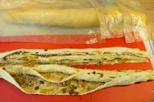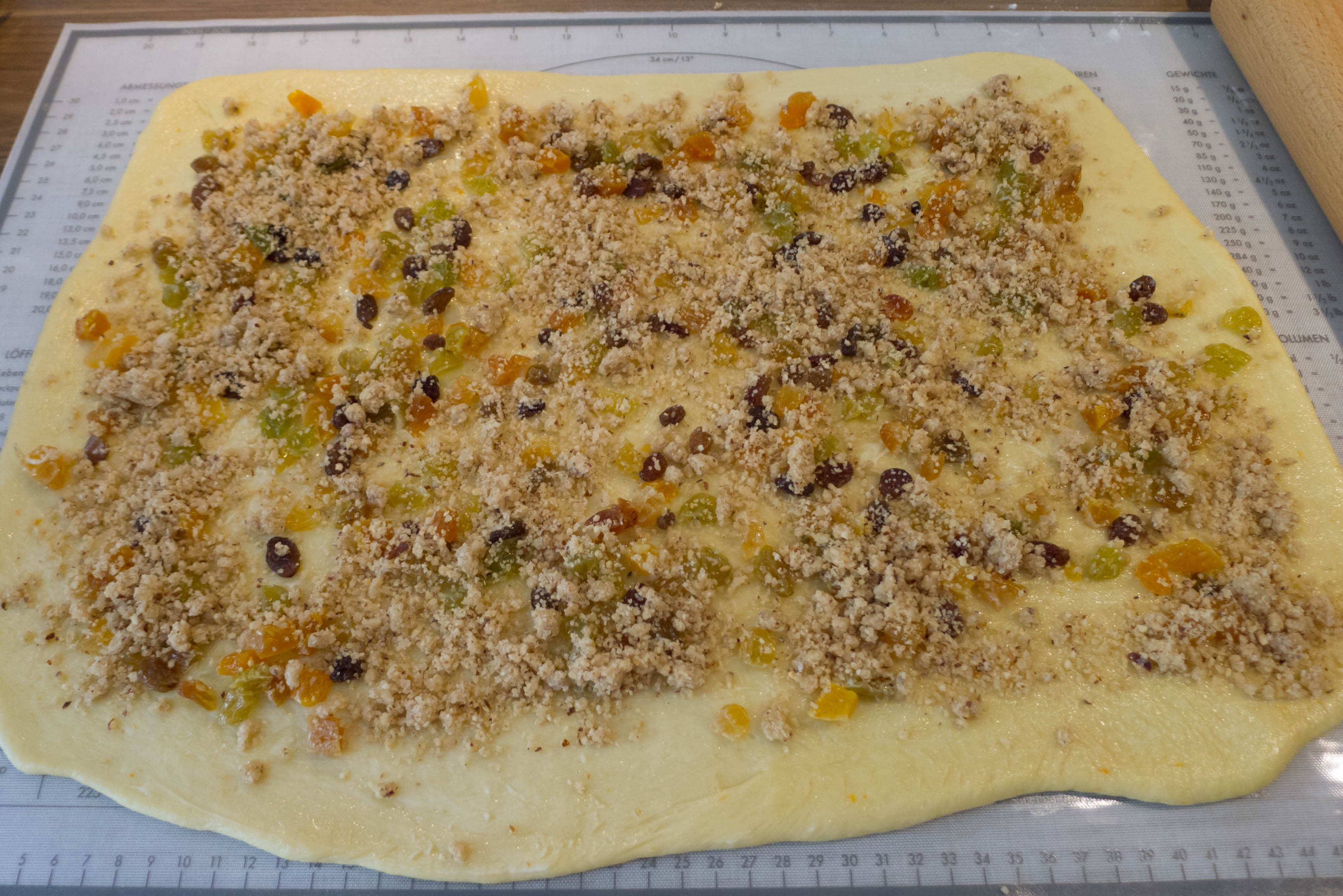 Den Teig mit dem Belag zu einer festen Rolle aufrollen und die Teigränder etwas andrücken. Die fertige Rolle abgedeckt etwas ruhen lassen und währenddessen aus den übrigen Zutaten eine zweite Rolle formen.