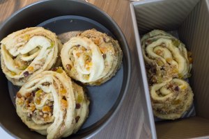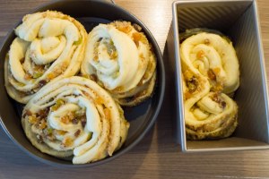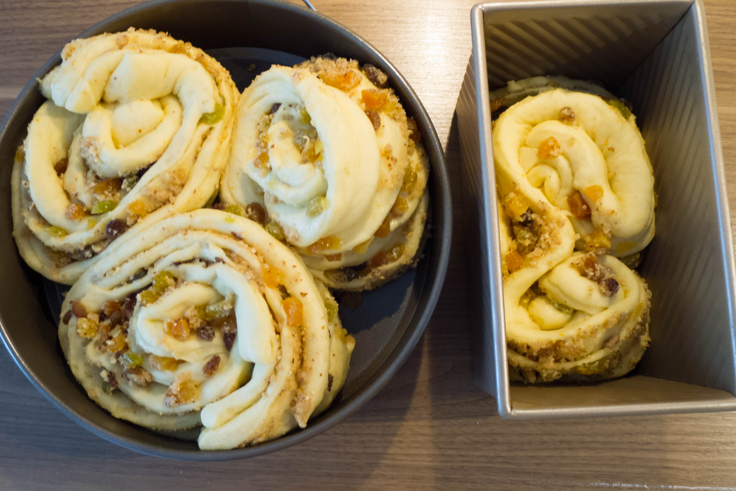 Die Hälften nun jeweils mit den Schnittflächen nach Außen zu Schnecken, Türmen oder wie auch immer gewünscht aufrollen. Die dabei herausgefallenen Anteile der Füllung wieder darauf geben und in eine Form der Wahl geben. In der Form sollte noch Platz bleiben (siehe Foto unten). Mit der zweiten Rolle in gleicher Weise verfahren. Ich habe drei „Turmschnecken“ in eine 26er Springform gegeben und die vierte etwas anders geformt in eine Brotform.