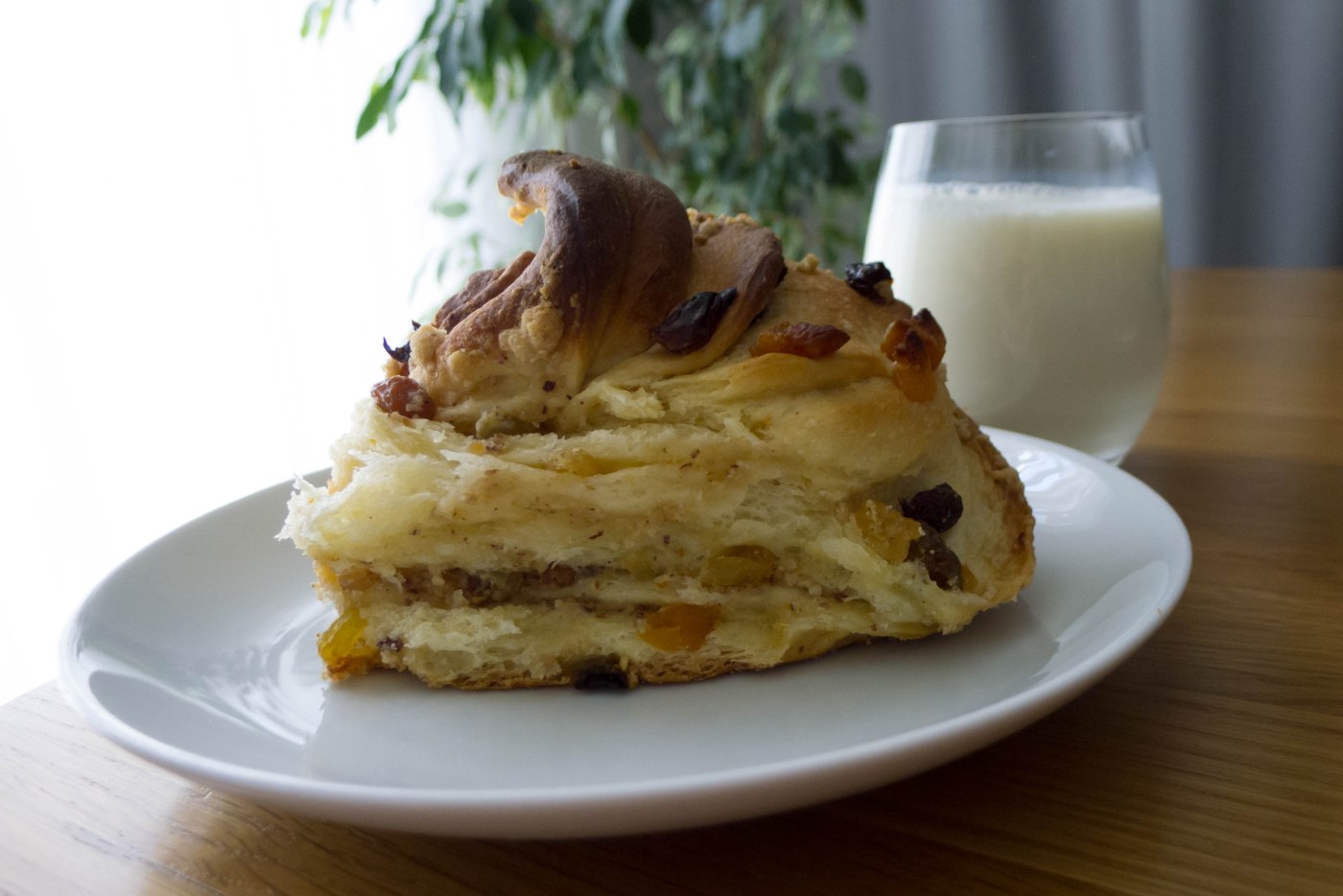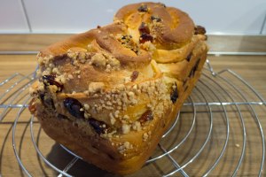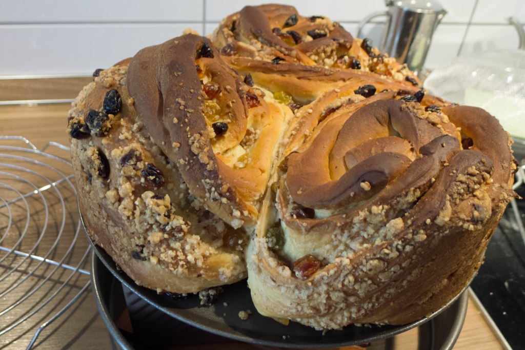 In meiner Kindheit wurden zu jedem Ostern „Pastje“ gebacken: ein süßes Hefegebäck mit Rosinen, das nach dem Backen mit einer Eiweiß-Zuckermischung bedeckt und mit bunten Zuckerstreuseln (oder zumindest bunt gefärbtem Zucker) bestreut wurde. In Deutschland angekommen hat sie kaum noch jemand gebacken und ich habe sie auch nahezu vergessen. Nur an Ostern fielen sie mir von Zeit zu Zeit ein, und manchmal fragte ich mich, wo dieses Gebäck eigentlich herkam. In Deutschland scheint es vollständig unbekannt zu sein, in meiner Kindheit im Süden Kasachstans hingegen hielt ich es für etwas urtümlich Deutsches. Letztes Jahr habe ich eine für mich erstaunliche Entdeckung gemacht: das gleiche Gebäck wird traditionell im russisch-orthodoxen Kulturkreis zu Ostern gebacken und heisst dort кулич (Kulic). Dann stieß ich auf eine russischstämmige, in Vietnam lebende Youtuberin, die den Kanal LudaEasyCook Позитивная Кухня betreibt. Sie hat vor etwa 4 Jahren zwei Dinge verbunden: den russichen Kulic und den kürzlich in Melbourne erfundenen Cruffin (Muffin aus Croissant-Teig). Sie hat auf ihrem Kanal nun schon mehrere Varianten des „Kulic Cruffin“ vorgestellt. Meine diesejährige Variante hat mich und mein Dauerversuchskaninchen endgültig überzeugt. Mit den Pastje meiner Kindheit hat das Gebäck nur noch entfernt zu tun: damals waren weder Orangen noch Zitronen frei verfügbar, erst recht keine Mandeln. Und eine Eiweiß-Zucker-Haube hat das Gebäck auch nicht mehr. Je nach Herkunft wird jeder beim Geschmack dieses Gebäcks an etwas anderes erinnert werden: ob nun an Pastje, Kulic, Panettone, Colomba pasquale, Rosinenschnecken oder einen Rosinen-Nuss-Zopf.