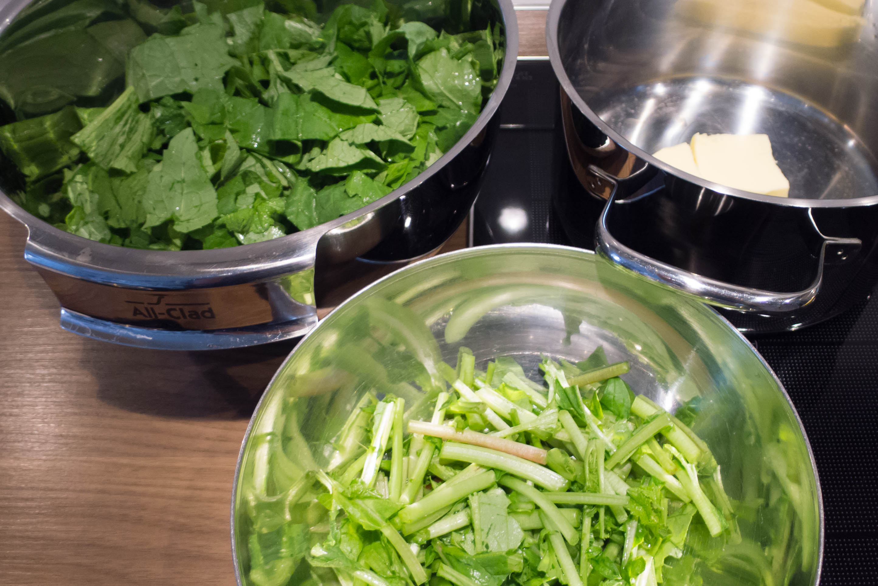 Das Rettichgrün gründlich waschen und – wenn vorhanden – schadhafte Stellen entfernen, Fraßlöcher stören dabei nicht. Harte Stiele vom Blattwerk trennen und jeweils etwas zerkleinern.