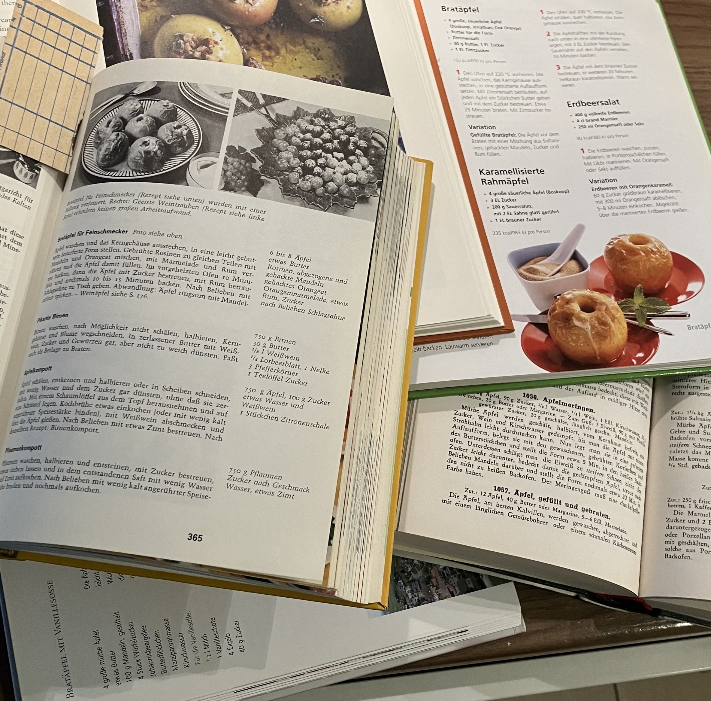 Bratäpfel sind ein sehr verbreitetes Gericht in Deutschland, z. B. mit Vanillesauce als Dessert oder an Weihnachten als Beilage zur Ente oder Gans. Selbst zubereitet hatte ich Bratäpfel bisher nur einmal vor vielen Jahren, soweit ich mich erinnere mit nur mäßigem Erfolg. Das heutige Wetter weckte Appetit auf Bratäpfel, also ging ich auf Rezeptsuche. Ich sah mir die Ideen im Internet an und beschloss zur Zweitmeinung meine Bücher zu befragen.