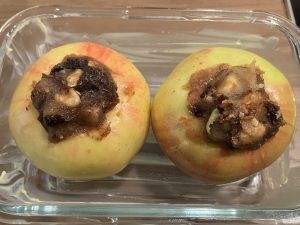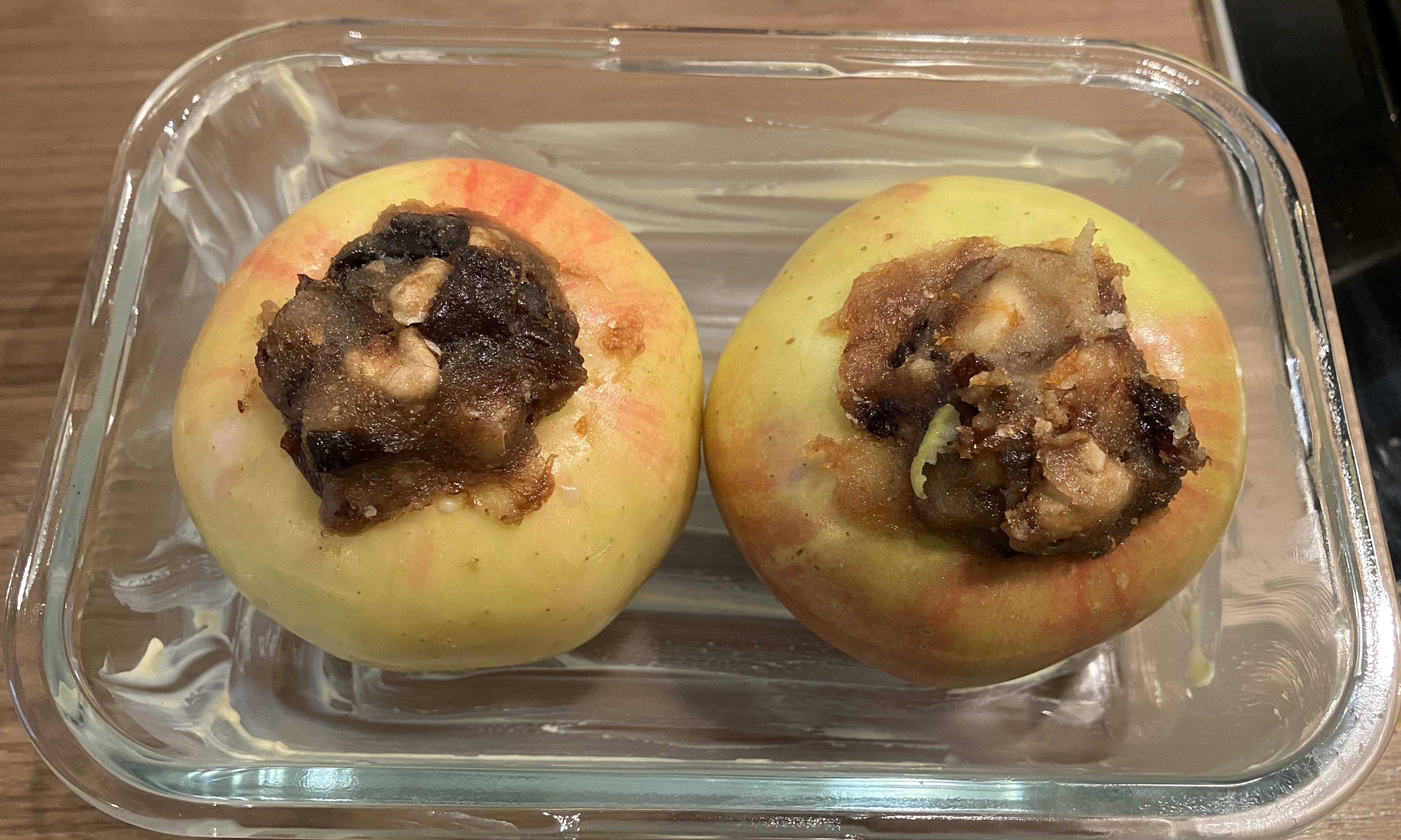 Die Gemeinsamkeit aller Rezepte, die ich gefunden habe: Äpfel waschen und entkernen, füllen und in eine gebutterte ofenfeste Form setzen. Im Backofen garen. Warm servieren. Für die Füllung hat mich keine der gefundenen Mischungen vollends überzeugt, also kombinierte ich aus mehreren meine eigene. Das Ergebnis hat uns sehr gefallen und wird auf jeden Fall wieder auf den Tisch kommen. Deswege hier das aktuelle Rezept. Die Mengenverhältnisse der Füllung sind nicht in Stein gemeißelt. Ich habe sie nach Augenmaß zusammengestellt und anschließend zur Erinnerung gewogen.