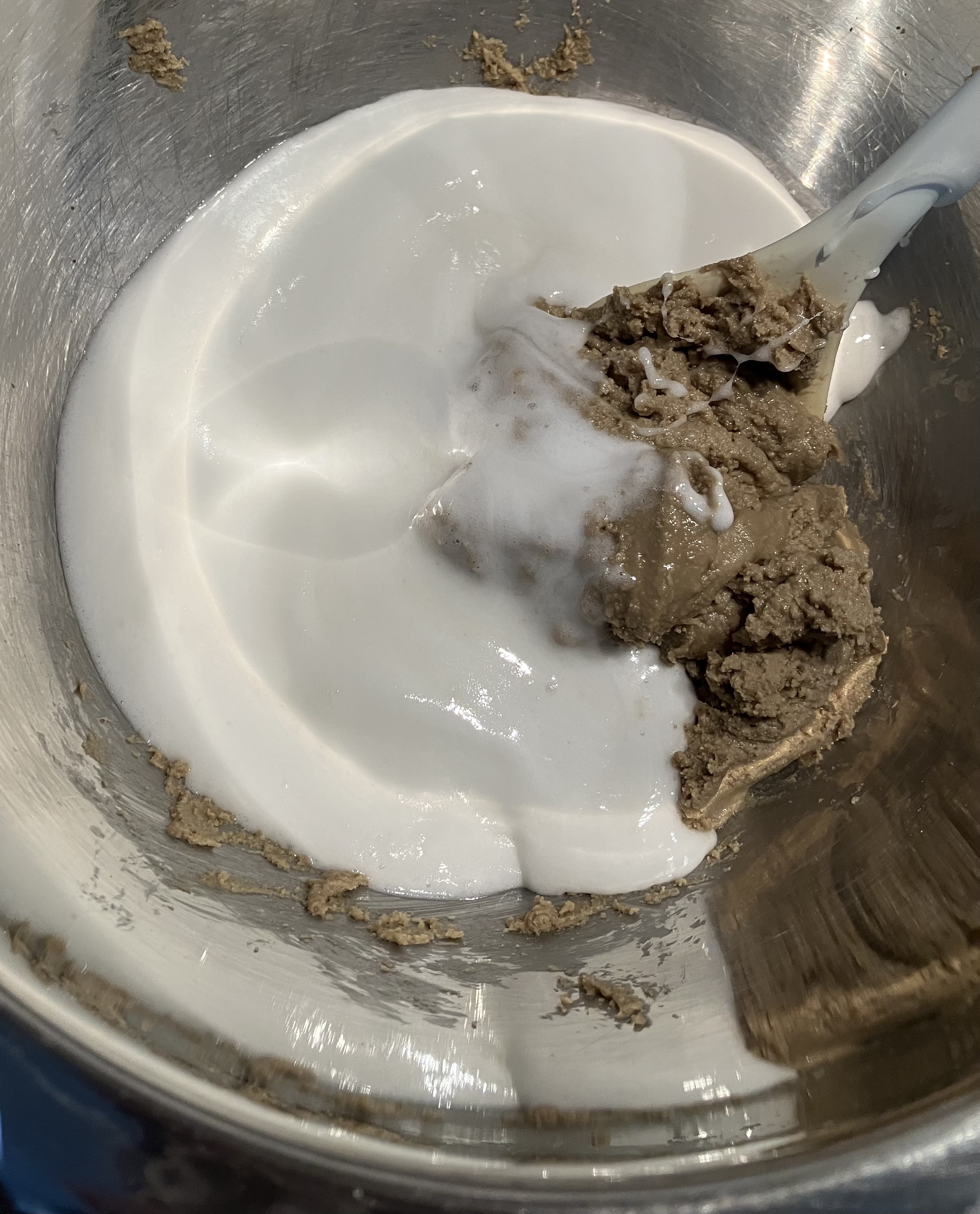 Beide Komponenten mit einem Kochlöffel in wenigen großen Bewegungen miteinander vermischen, die Mischung muss dabei nicht vollständig homogen werden. Die Halva in die vorbereitete Form füllen bevor sie erkaltet und sich verfestigt.