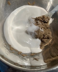 Ab jetzt ist die Zubereitung zeitsensitiv, d. h. jede Pause kann sich negativ auf das Endprodukt auswirken. Das Eiweiß z.B. mittels Mixer in einer kleinen Rührschüssel zu einem weichen Schaum aufschlagen und inkl. Mixer so stehen lassen. Nun den Zucker mit dem Wasser in einem Topf so lange erhitzen, bis der Zucker gelöst ist und die Mischung die Temperatur von 121°C erreicht hat. Sofort den Mixer erneut einschalten und die Zuckerlösung in einem dünnen Strahl unter das Eiweiß mischen. Sobald die Eiweiß-Zucker-Mischung homogen ist und eine etwas ziehende Konsistenz hat, den Mixer ausschalten und die Mischung zum Kernmus geben: