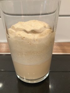 Hefe und Zucker in ein Glas geben und mit einem geringen Teil (etwa 100 ml) des Milch-Wassergemisches auflösen, einen Löffel Mehl unterrühren. Für 10 Miniten beiseite stellen, bis dahin sollte die Mischung bereits eine große Schaumkrone gebildet haben, in etwa so:
