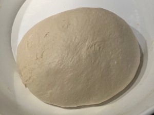 Den Teig abdecken und an einem warmen Ort 20-30 Minuten entspannen lassen. Er wird dabei etwas wachsen aber weiterhin ungleichmäßig aussehen. Dann lässt er sich aber mit einmaligem Strecken und Falten in eine glatte Kugel formen: