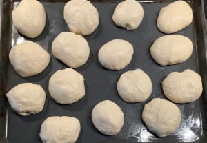 Das Blech in den vorgeheizten Ofen geben und schnell einige Sprühstöße Wasser verteilen (hilft den Brötchen beim Aufgehen und gibt eine bessere Kruste). Die Brötchen etwa 20 Minuten backen lassen.