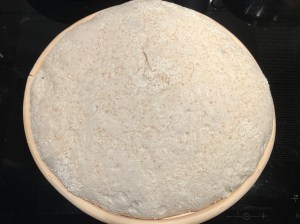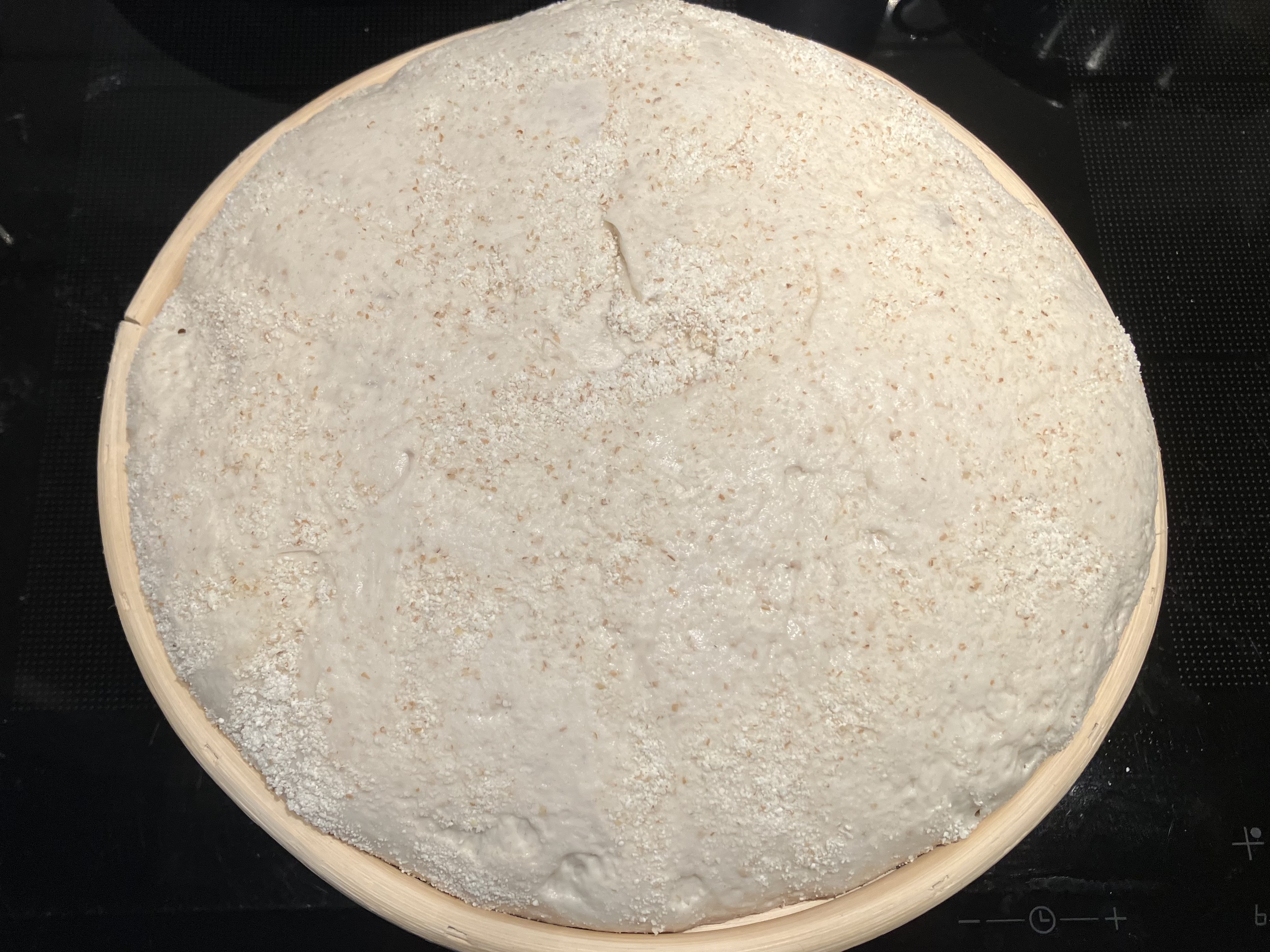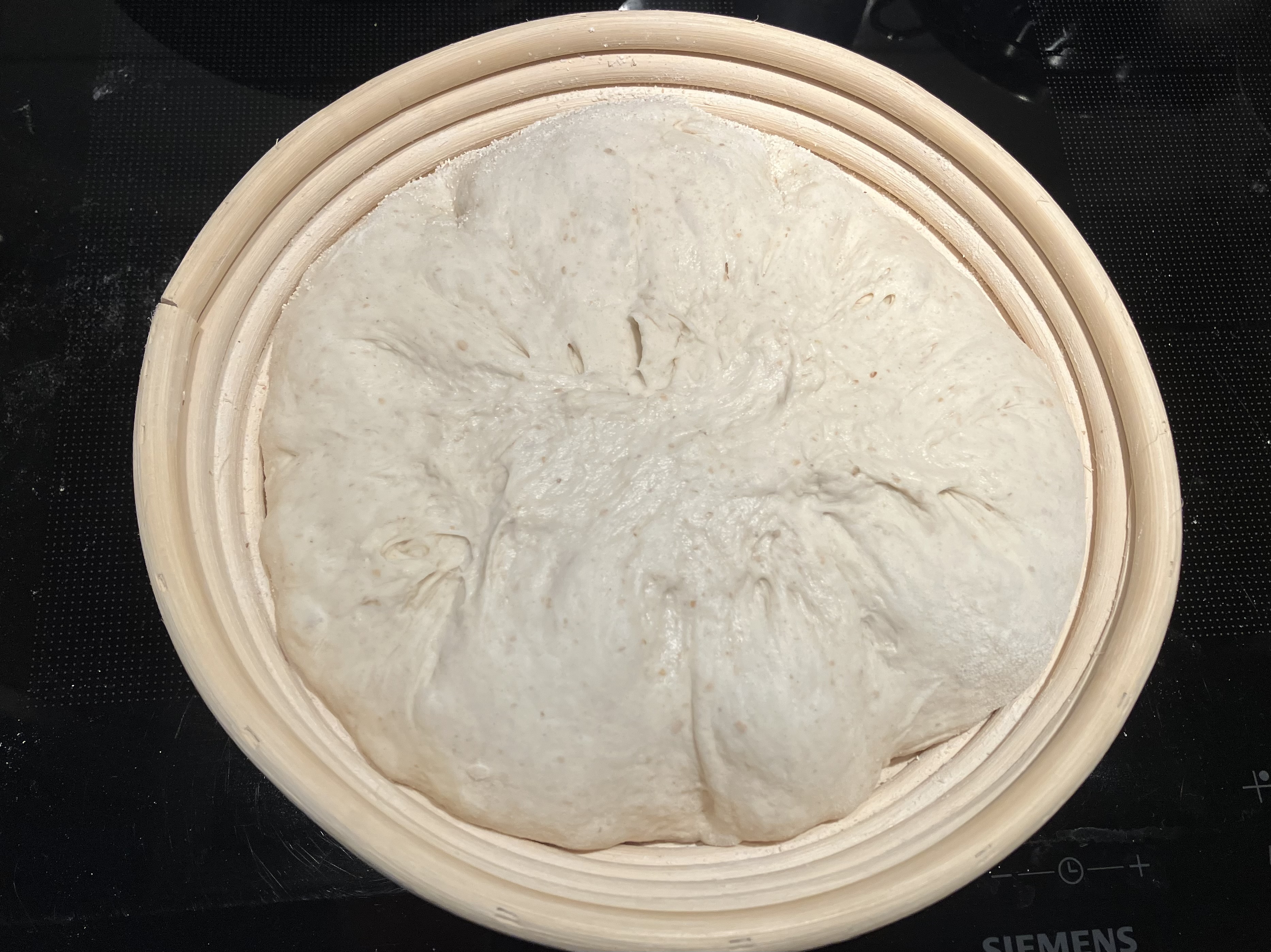 Den aufgegangenen Teig vorsichtig auf eine gut bemehlte Arbeitsplatte stürzen und zu einem Brotlaib formen. Mit dem Schluss nach oben in ein gut bemehltes Gärkörbchen legen (ich benutze für dieses Brot weiterhin gerne Grieß). Auch von oben gut mit Mehl oder Semolina bestreuen, abdecken und bei Zimmertemperatur stehen lassen, gegebenenfalls erneut warm stellen. Bei mir entwickelte sich in den heißen Sommertagen der letzten Wochen der Teig innerhalb von anderthalb Stunden so: