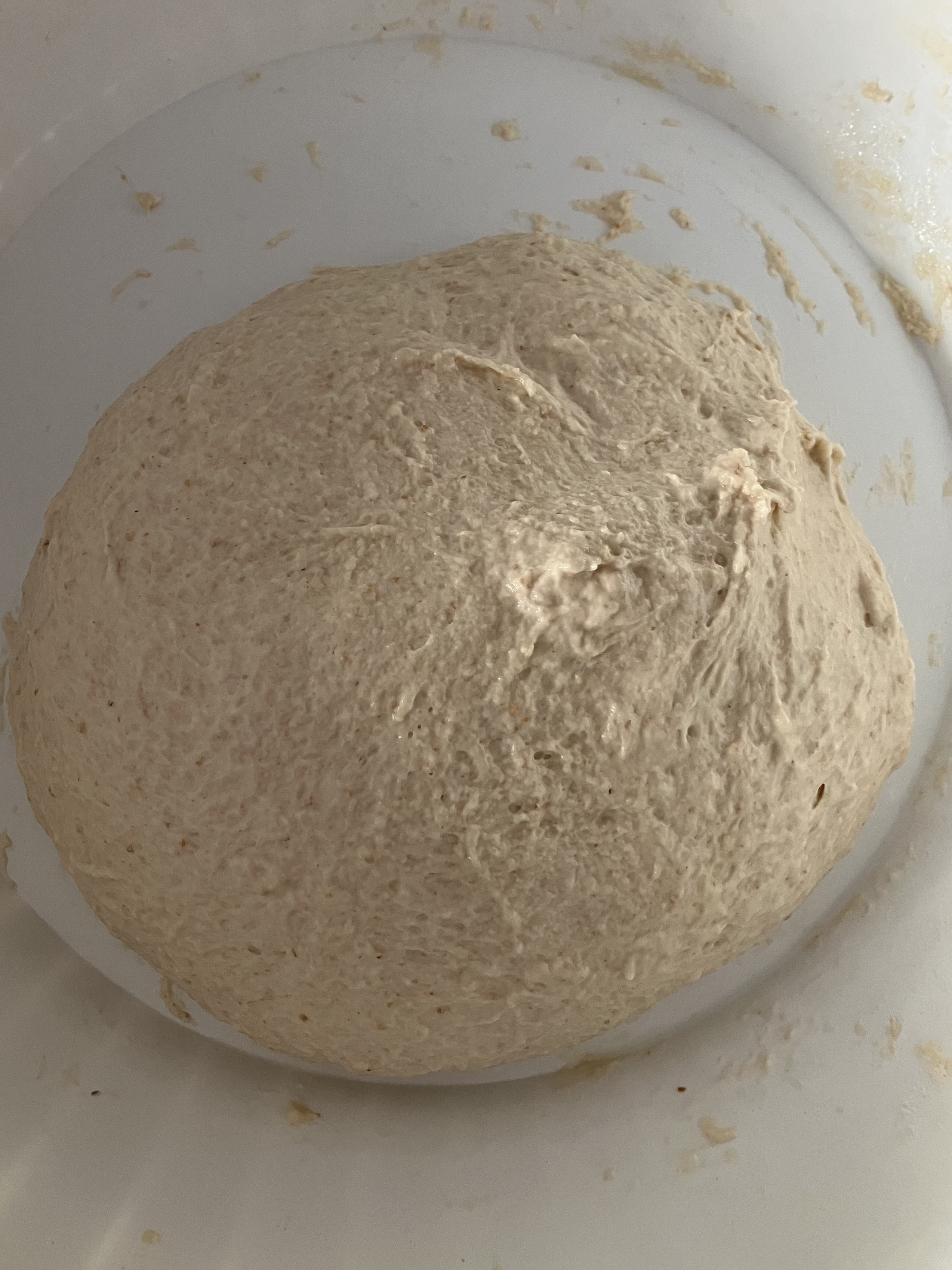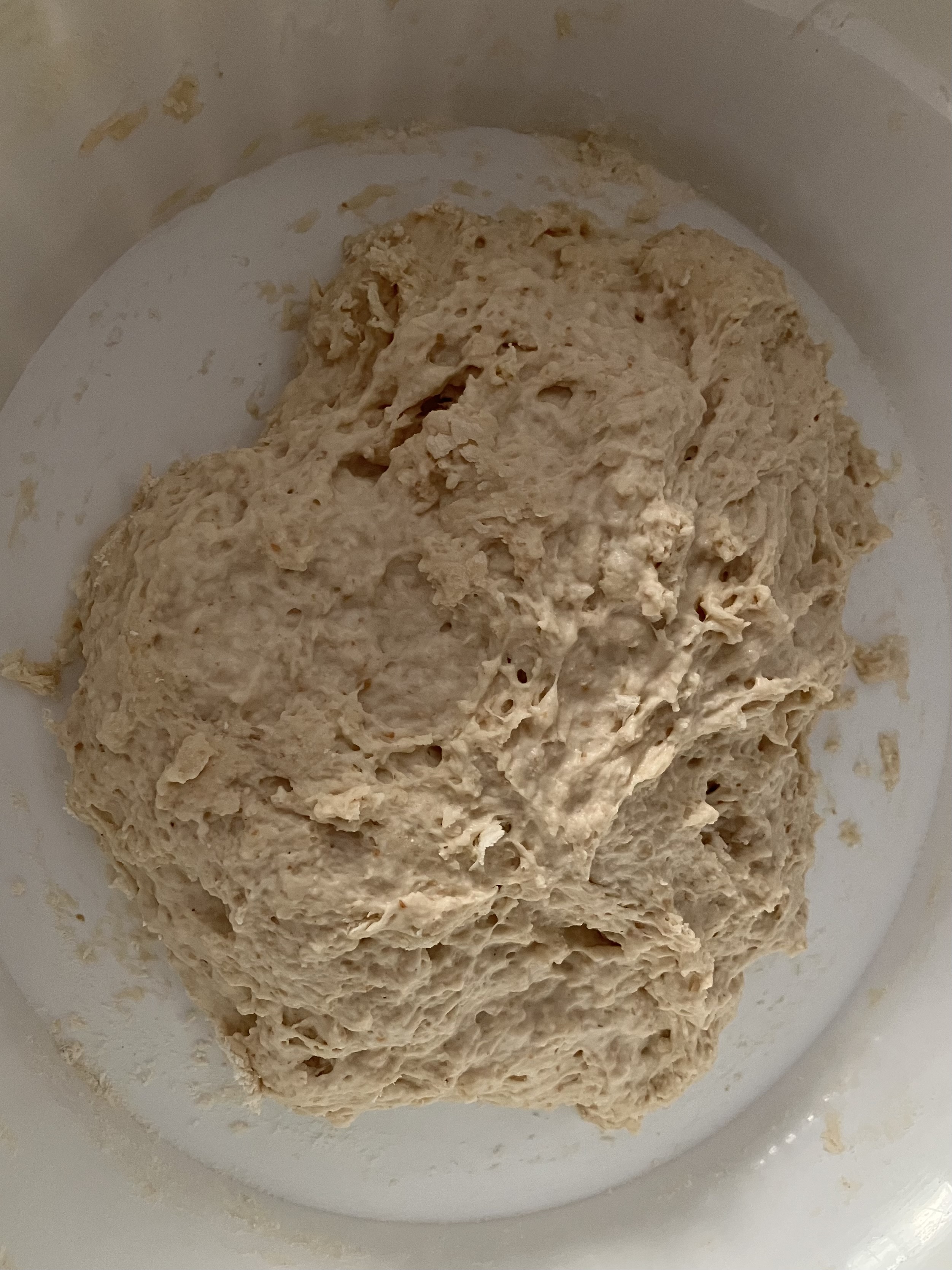 Den Teig etwa 10 Minuten entspannen lassen. Nun das Salz dazugeben und den Teig etwa 5 Minuten kneten. Dabei evtl. weiteres Wasser dazugeben (hängt sehr vom Mehl ab und vom eigenen Mut mit nassen Teigen zu arbeiten, die genaue Wassermenge ist also sehr variabel) aber kein weiteres Mehl mehr einkneten. Nicht verzweifeln, wenn der Teig noch klebrig ist. Wenn die Schüssel das Arbeiten beengt, den Teig ggf. auf eine leicht bemehlte Arbeitsplatte geben und mit Hilfe einer Teigkarte zu einem Ball formen, dann ohne Abdeckung 10 Minuten ruhen lassen. Er wird zu diesem Zeitpunkt noch nicht wirklich glatt sein und könnte zum Beispiel so aussehen: