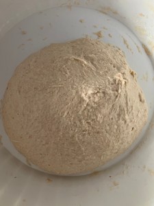 400 g Wasser abmessen, einen Teil davon zum Sauerteig geben und mit einem Löffel gründlich durchrühren. 575 g Mehl in eine große Teigschüssel geben, die Sauerteig-Wasser-Mischung mir dem Löffel unterrühren. Nach und nach vom abgemessenen Wasser dazugeben und verkneten bis keine trockenen Mehlnester mehr zu sehen sind. Der Teig sieht dann etwa so aus: