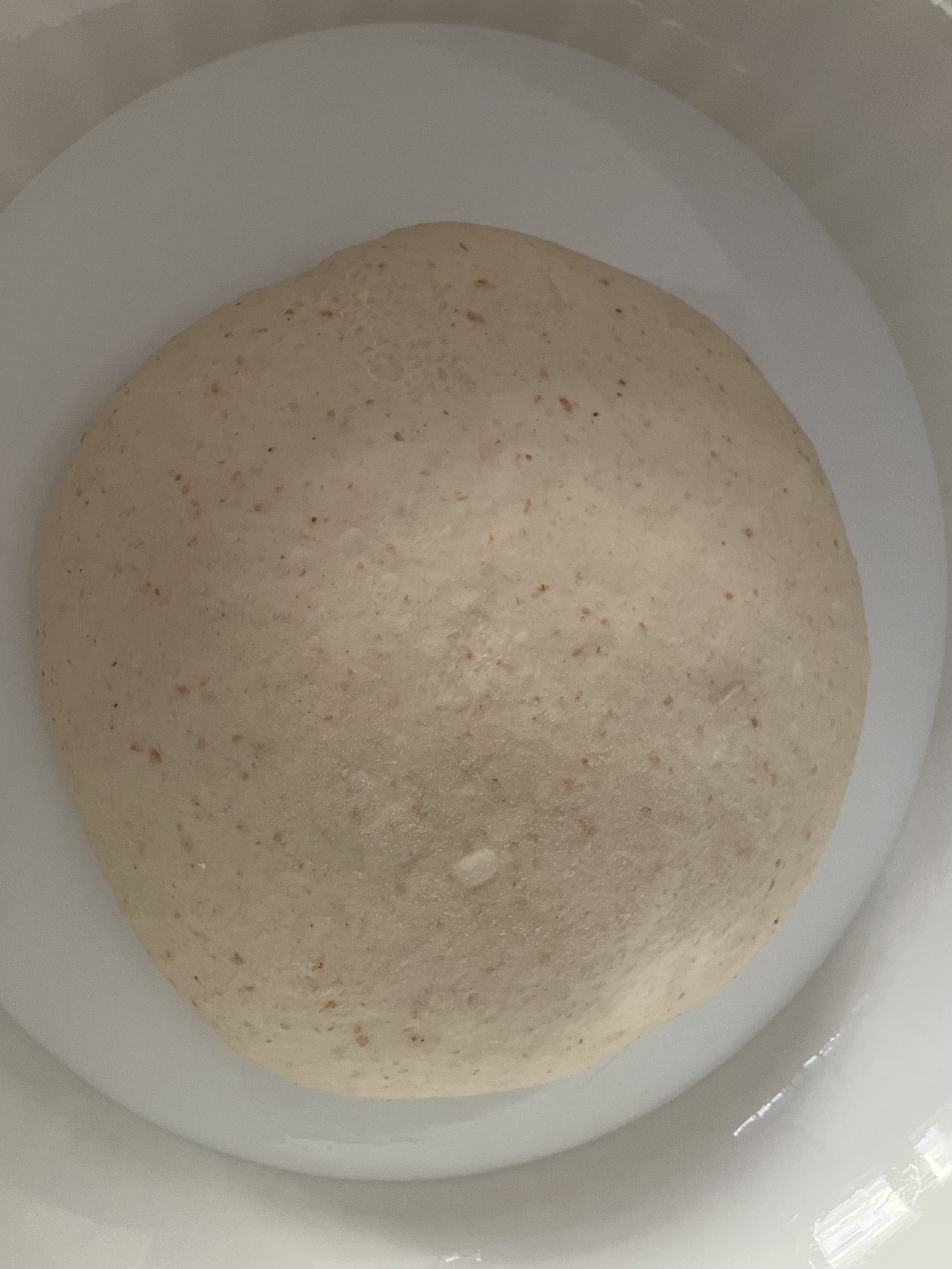 Den Teigling dehnen und falten, wieder zu einem Ball formen und abgedeckt 10 Minuten ruhen lassen. Erneut dehnen und falten, den Teig wieder zu einem Ball formen, in eine leicht geölte Schüssel oder Wanne geben und abgedeckt gehen lassen. Nach etwa einer halben und nochmals nach etwa einer weiteren halben Stunde jeweils mit nassen Händen eine schonende Wickelfaltung vornehmen (coil fold). Durch diese Bearbeitung wird der Teig nun ein schönes, glattes Aussehen erreicht haben, zum Beispiel so: