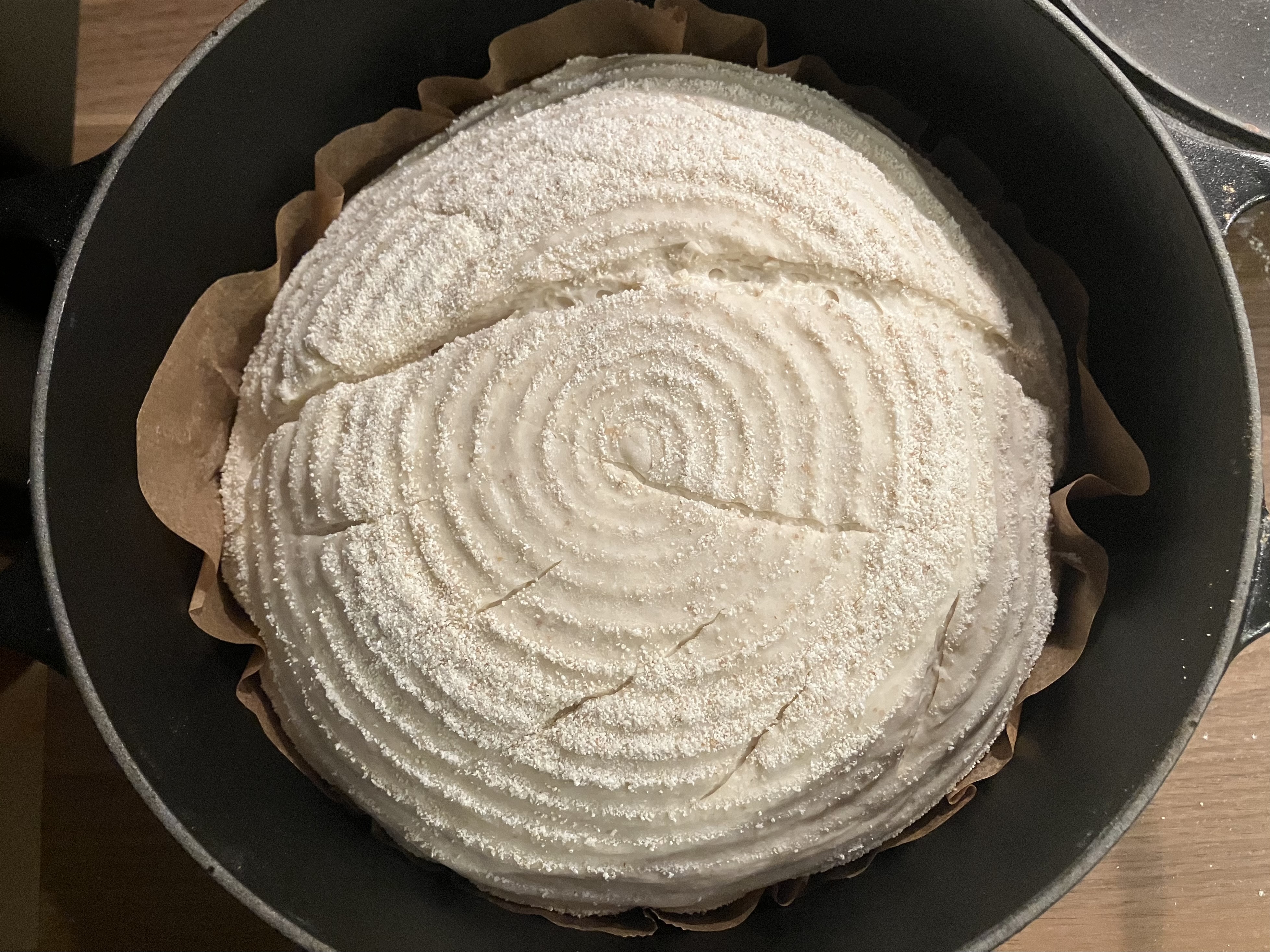 Wenn der Teig soweit ist, vorsichtig auf ein Backpapier stürzen und in den Topf heben, nach Belieben einschneiden: