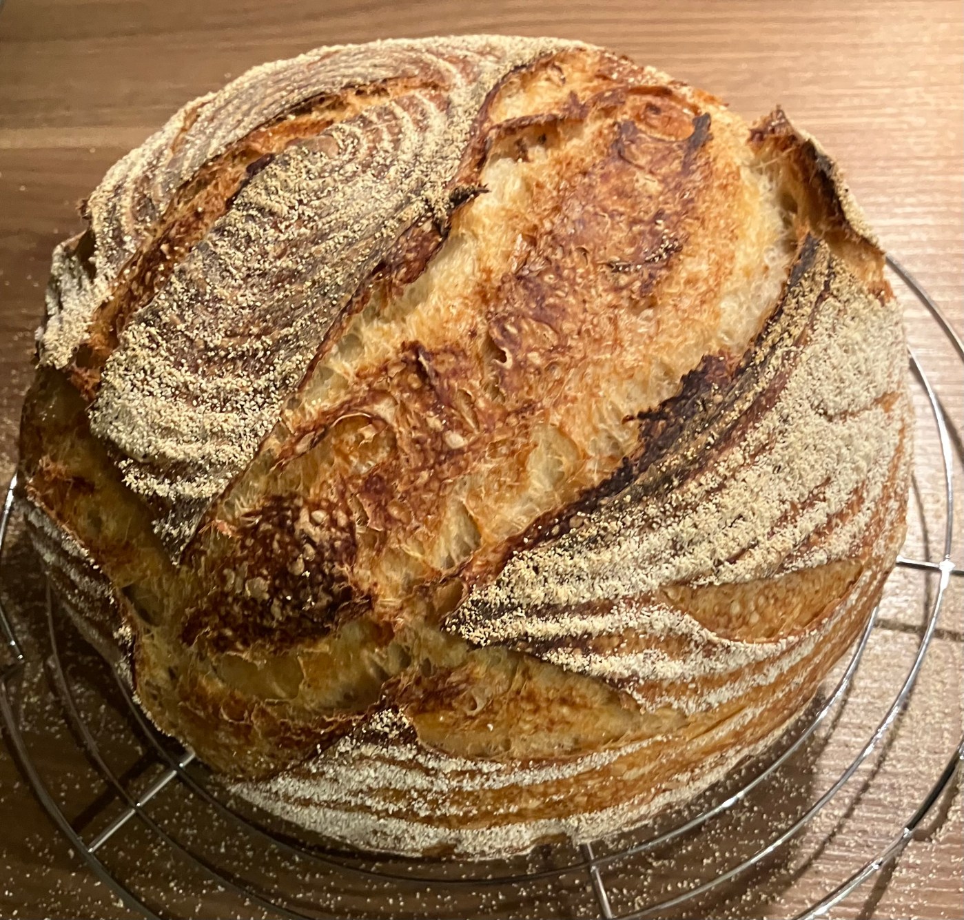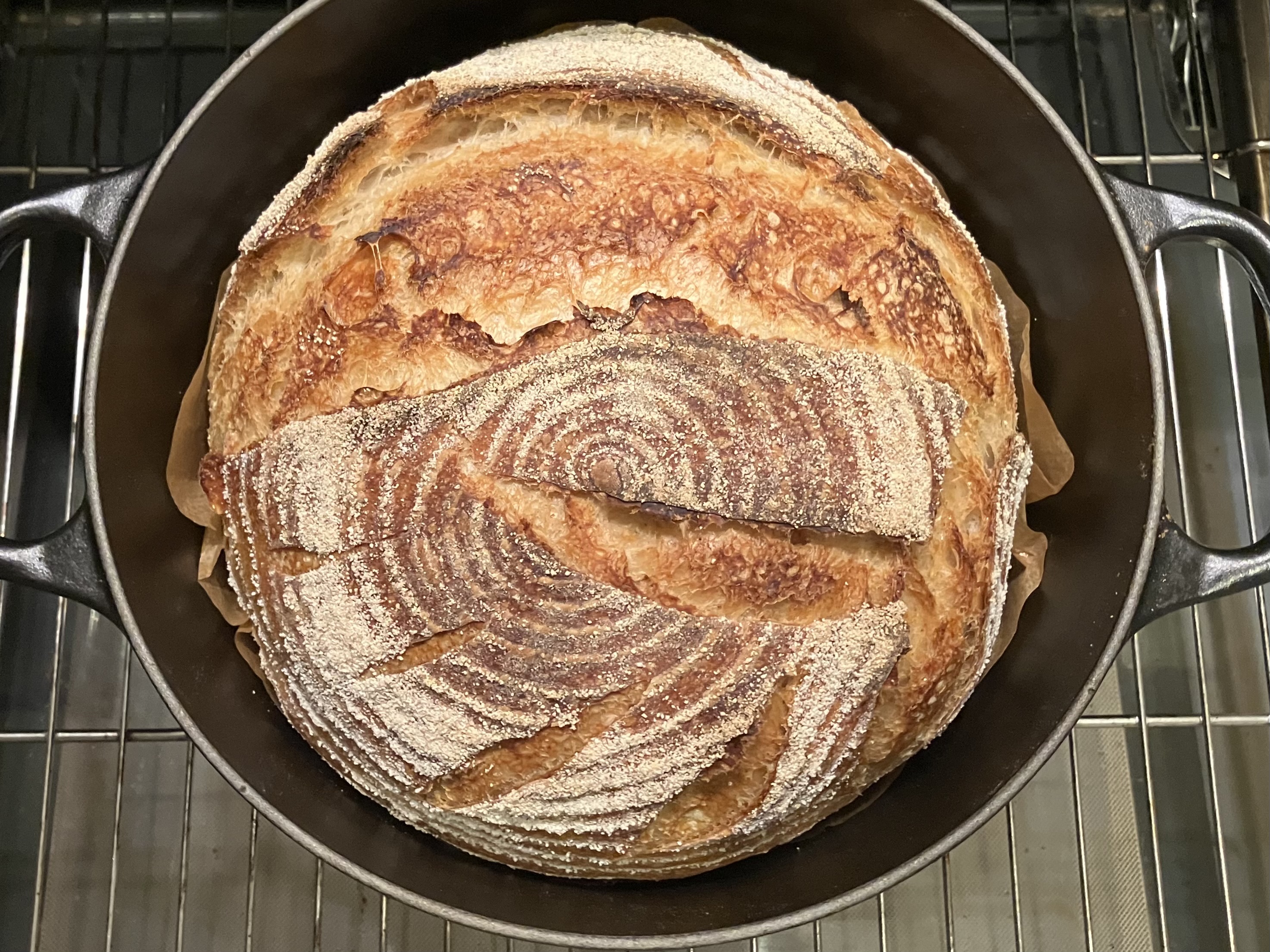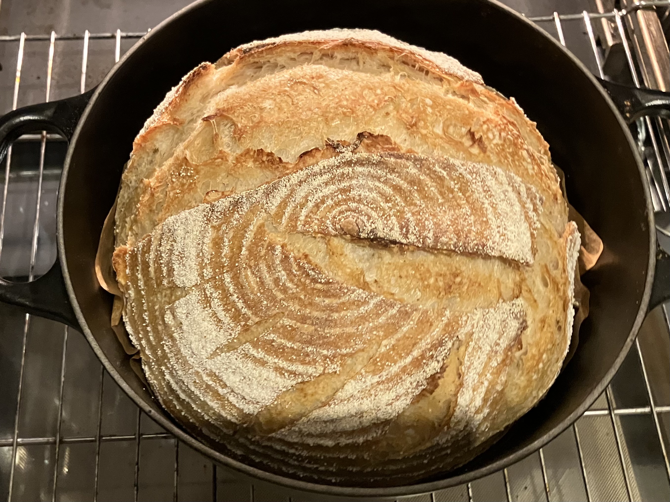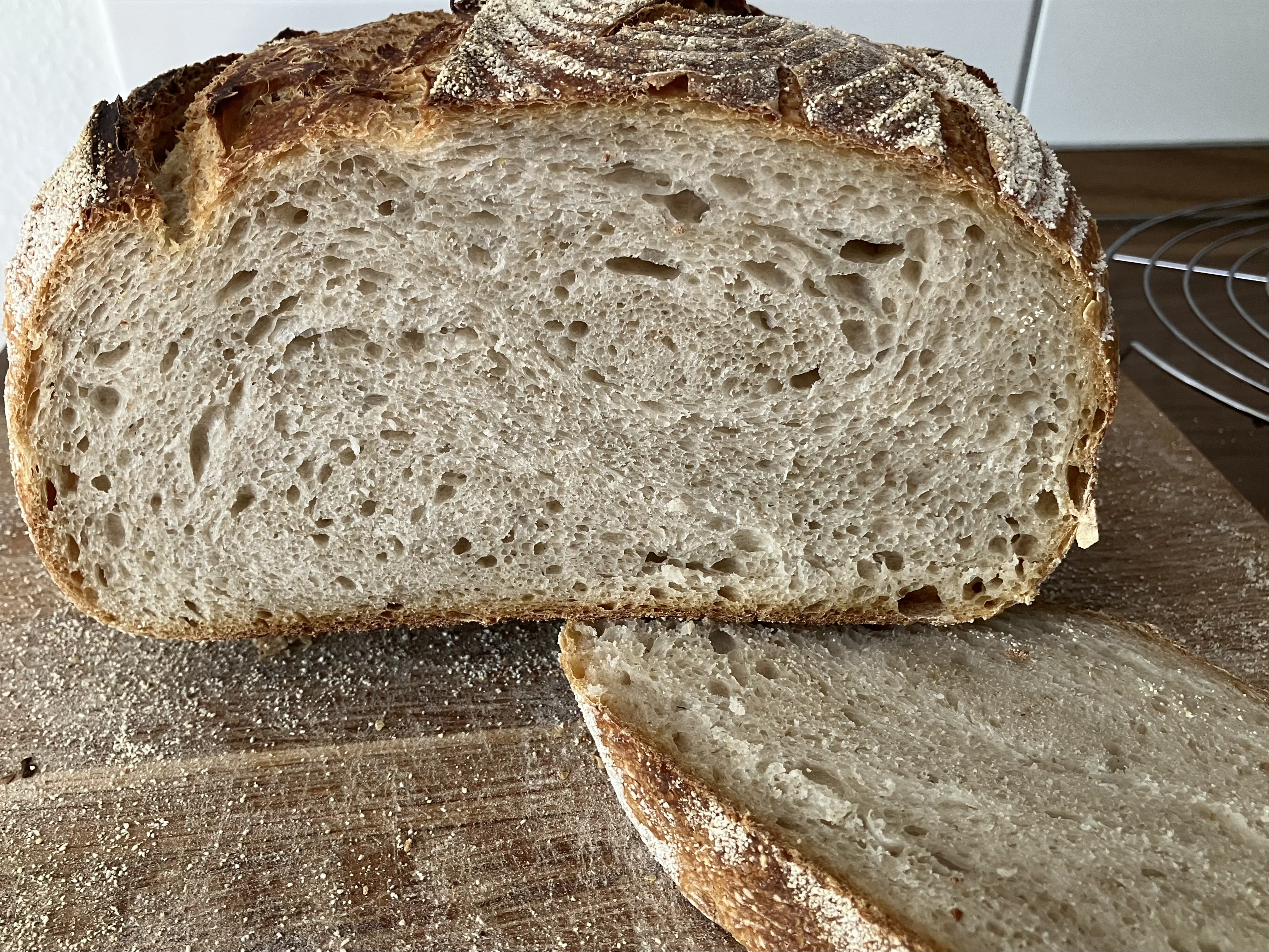 Dieses Brot hat sich aus meinem Alltagsbrot entwickelt. Mittlerweile ist es zu einem reinen Sauerteigbrot ohne Hefe geworden. Während ich mich im Winter weiterhin über freigeschobene Brote vom Backstein freue, habe ich hier eine sommertaugliche Variante: das Brot kommt im kalten Gusseisentopf in den nicht vorgeheizten Ofen. Nach einer guten Stunde ist das Brot fertig und der Ofen kann wieder aus. Ein Vorteil des Backens im Topf: das Brot behält seine Form, kann nicht zum Fladen breitlaufen und verzeiht einem somit einige Fehler. Zudem ist dieses mein Mehlreste-Aufbrauch-Brot: was immer an Weizen- (und Dinkel-) Mehlen im Vorrat aufgebraucht werden will, kommt hier rein — von 405 bis Vollkorn in variablen Mischungsverhältnissen oder reinsortig, selbst Mehle mit einem Jahr über MHD waren schon dabei.
