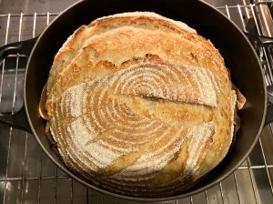 Das Brot aus dem Topf heben, auf einem Gitter Erkalten lassen, anschneiden und genießen. Dieses Brot ist sehr gut haltbar, es lässt sich gut drei Tage offen mit der Schnittfläche auf dem Schneidebrett lagern und danach noch bis zu einer Woche verpackt.