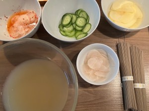 In einer großen Schüssel Rinderbrühe und Kimchi-Lake geben, mit 5 g Sojasoße, 12 g Zucker, 23 g Essig, 6 g Salz und 3 g Senf vermischen. Nun mindestens die Hälfte in der Eismaschine zu einem Slushi/Sorbet gefrieren lassen und den Rest so lange kühlstellen. (Alternativen: die gesamte Schüssel für mindestens 4-5 Stunden ins Eisfach geben bis sie etwa zur Hälfte gefroren ist; oder eine Hälfte der Brühe mindestens über Nacht als Eiswürfel einfrieren). In der Zwischenzeit die übrigen Zutaten vorbereiten: