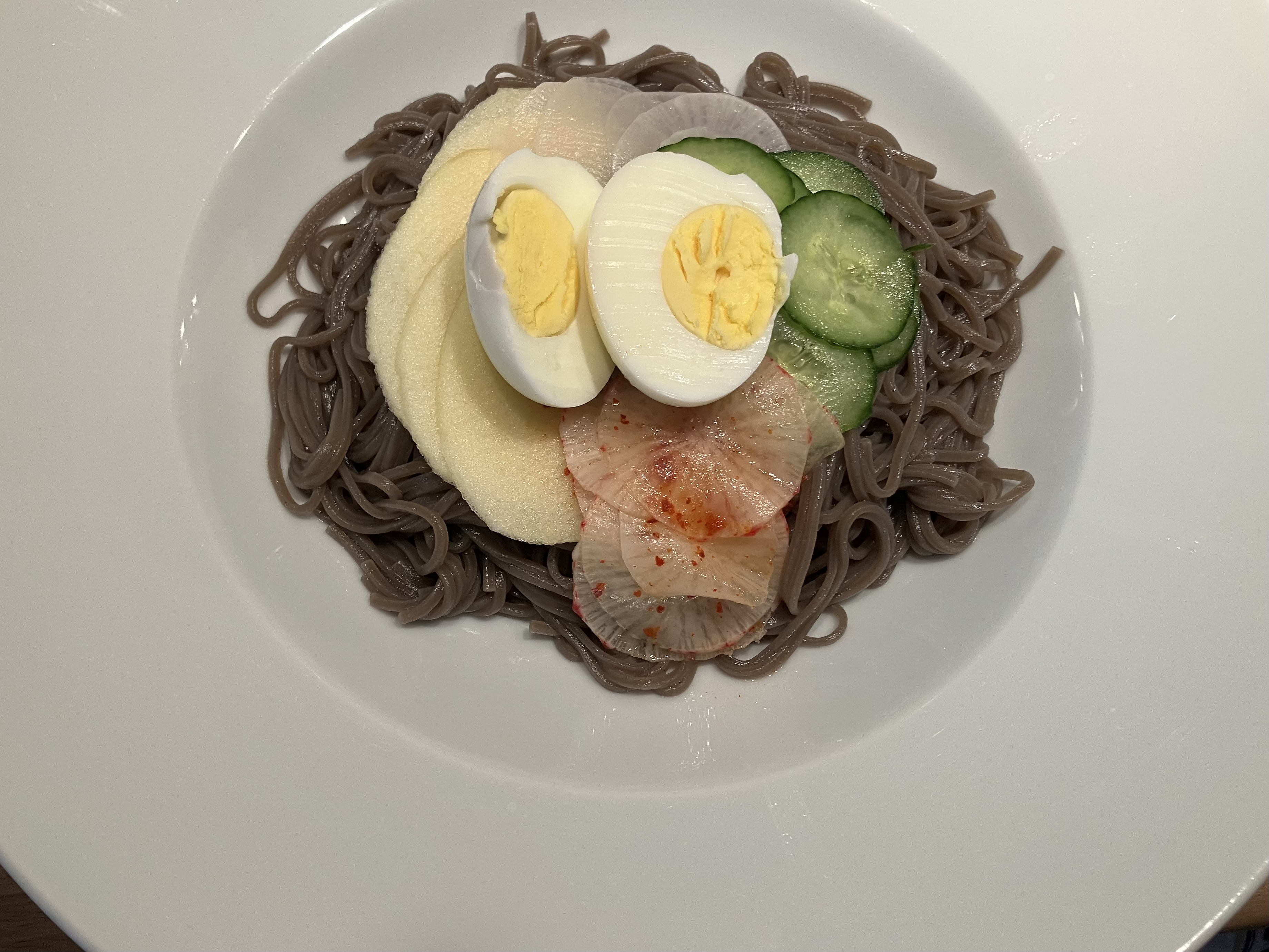 Die Nudeln in zwei große tiefe Teller geben. Darauf beide Rettichsorten, Gurke, Birne, Ei und ggf. Fleisch dekorativ anrichten.
