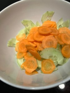 Die Gurken- und Karottenscheiben ausdrücken, in kaltem Wasser das überschüssige Salz abwaschen und nochmals ausdrücken.