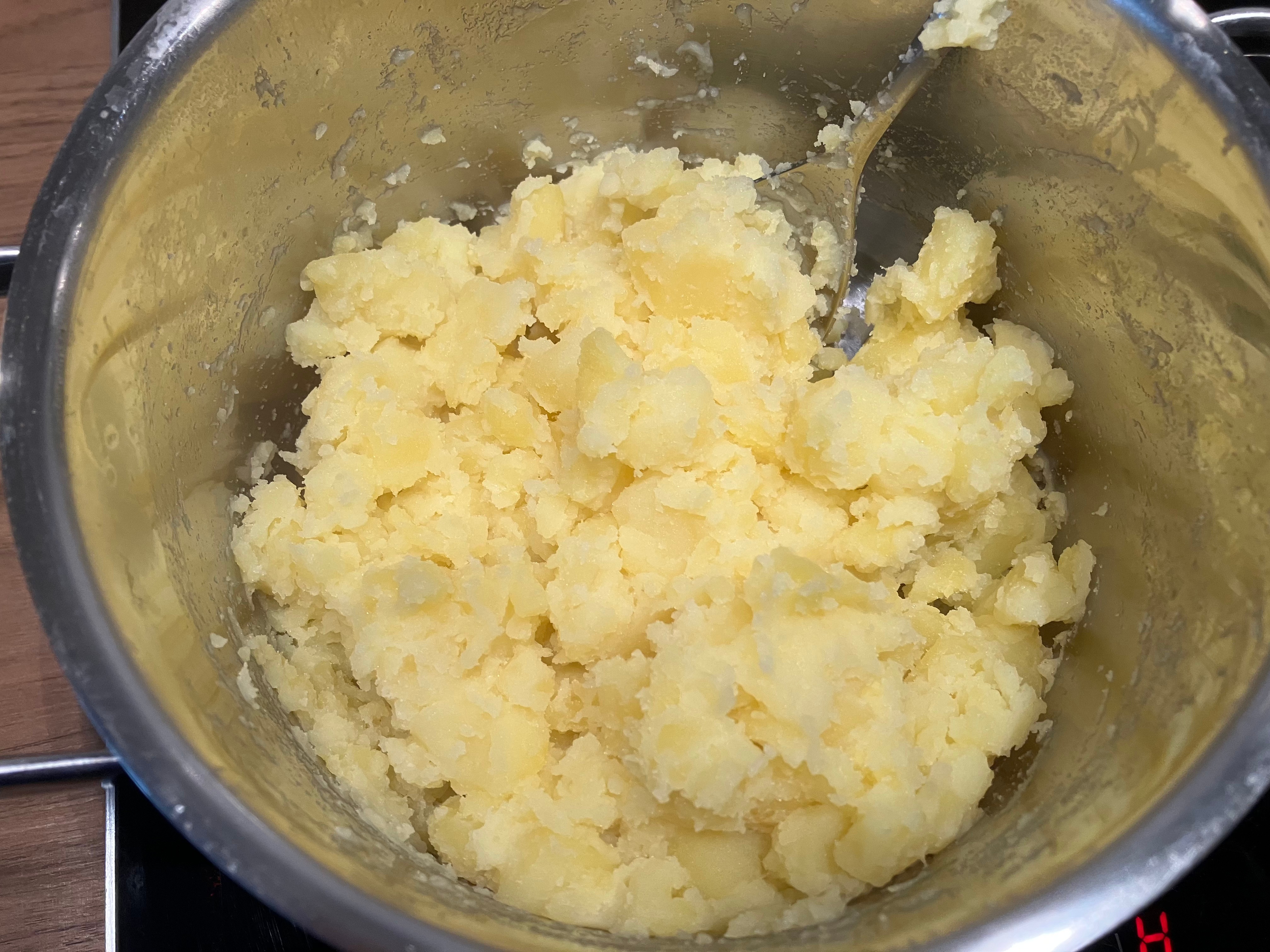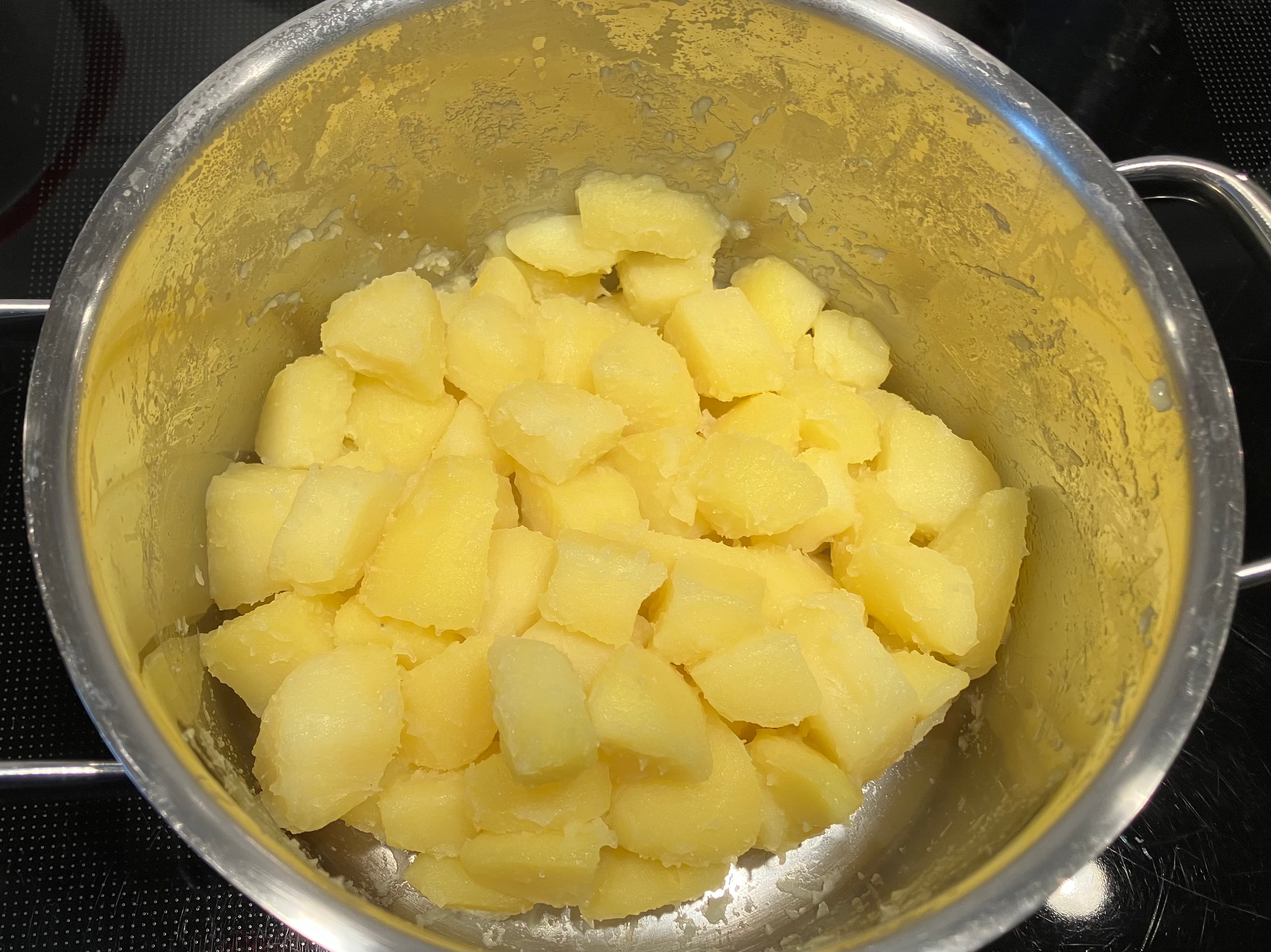 Die Kartoffeln schälen, in Würfel schneiden und in kaltem gesalzenem Wasser zum Kochen aufstellen. Sobald die Kartoffeln gar sind, abgießen, zurück in den heißen Kochtopf geben und mit aufgelegtem Deckel gut duchschütteln, damit sich die Kartoffeloberfläche etwas aufraut.