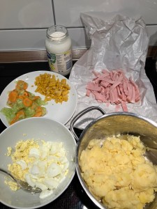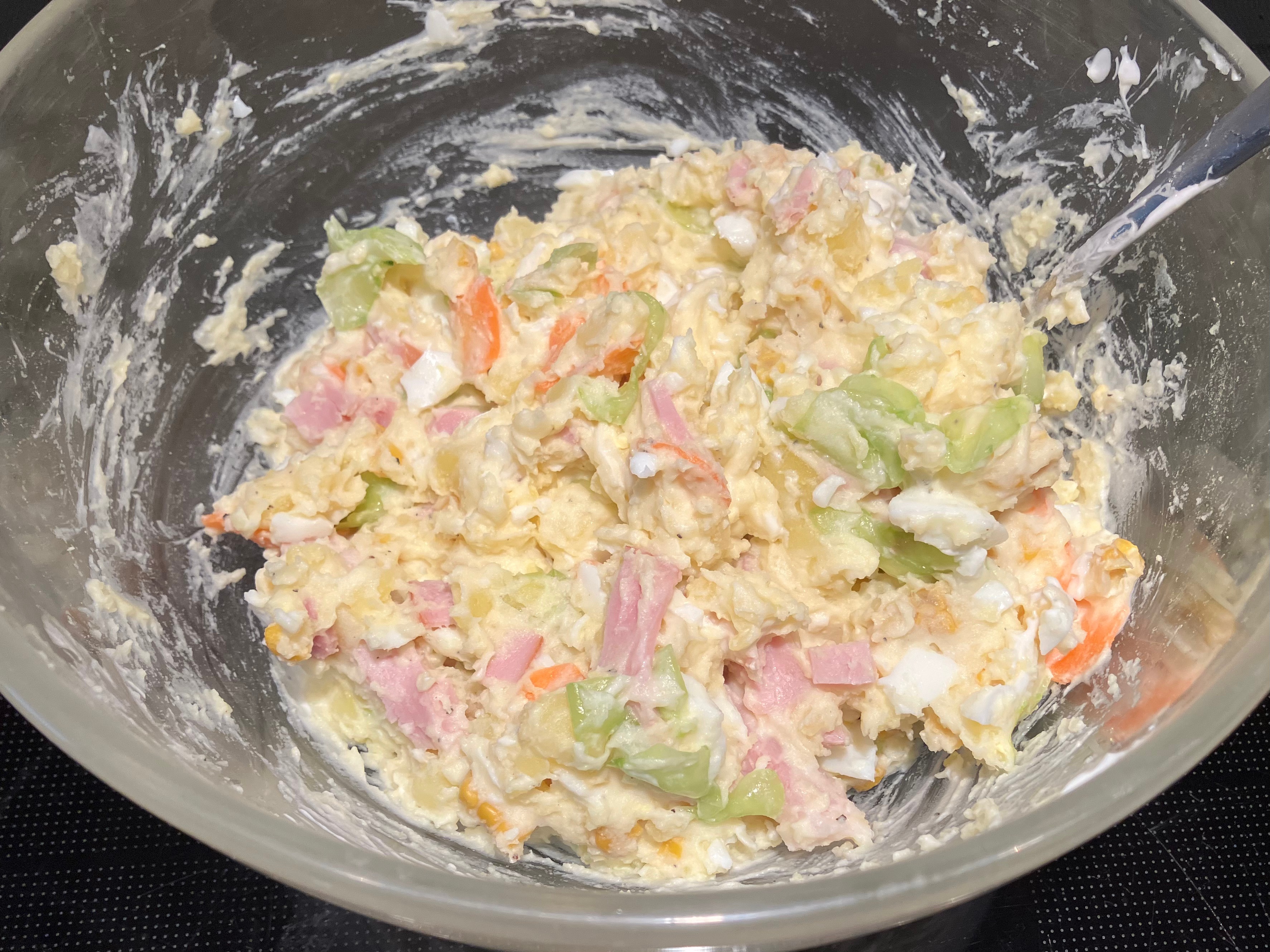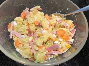 Die abgekühlten Kartoffeln in eine große Schüssel umfüllen, die Eier dazugeben und locker durchmischen. Gurken, Karotten, Mais und Schinken dazugeben und gut durchmischen.