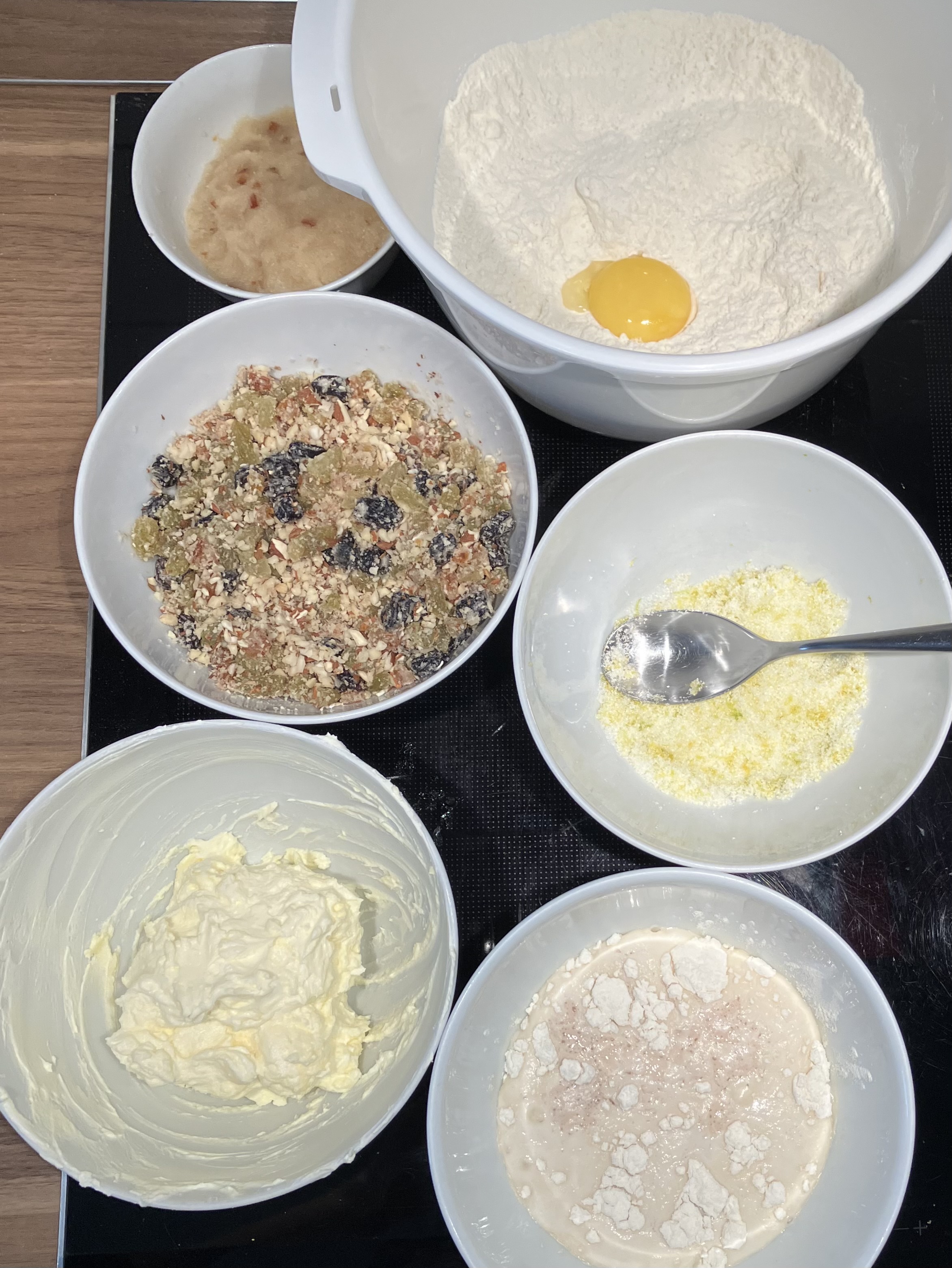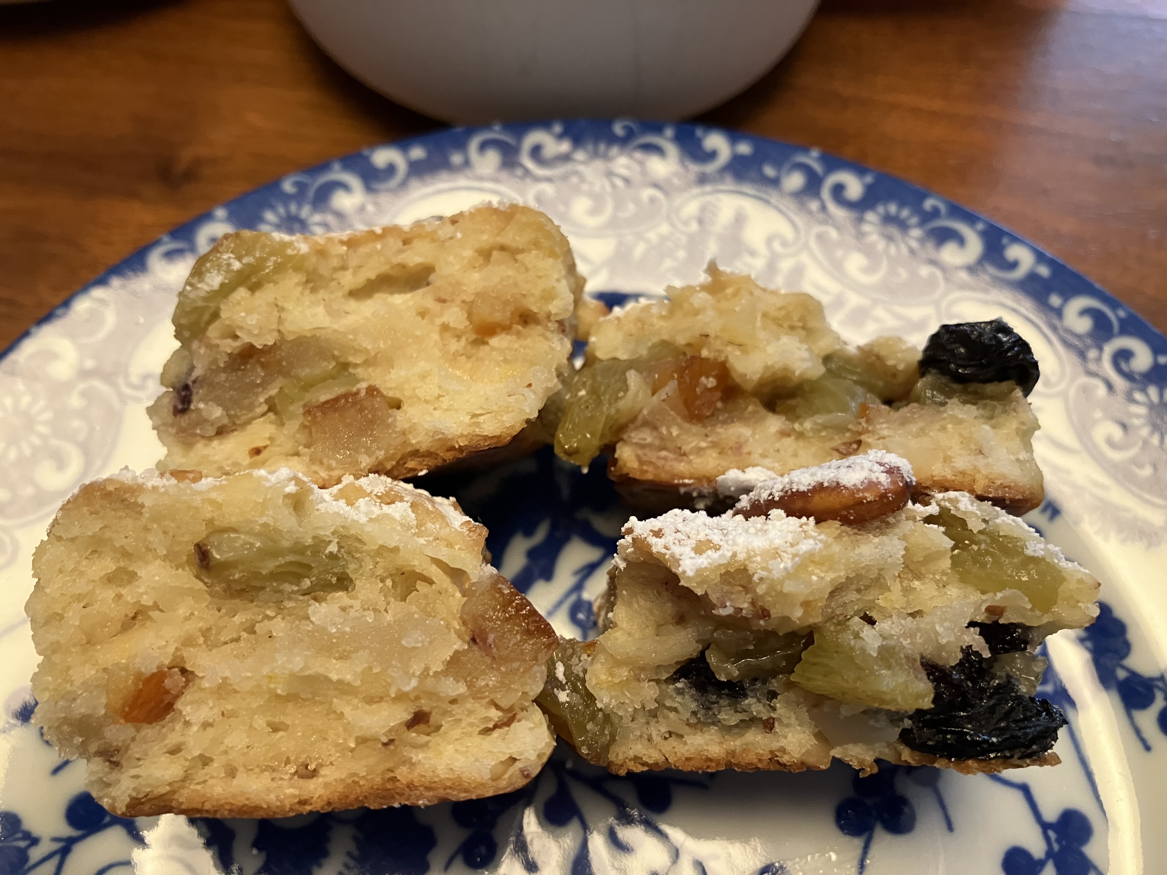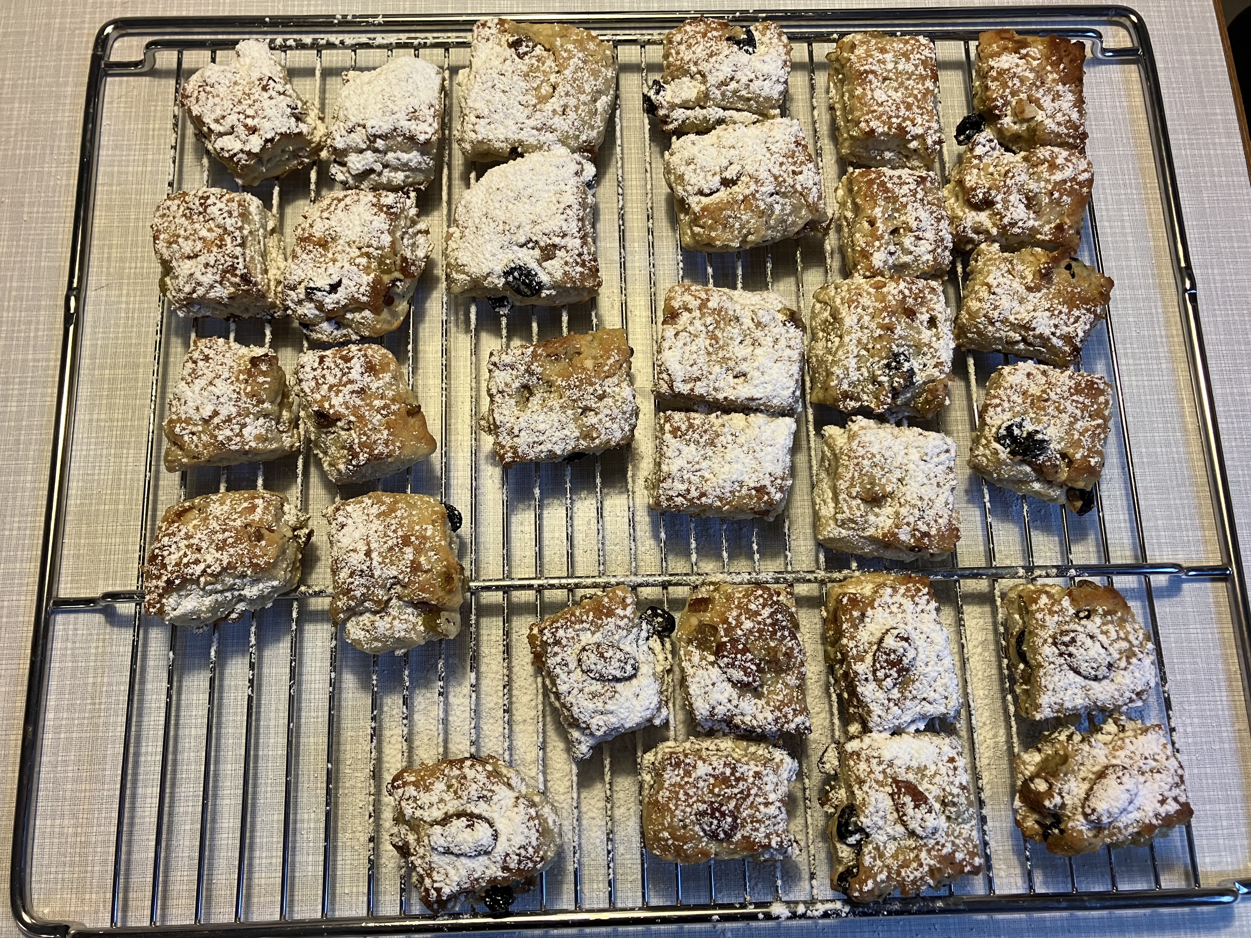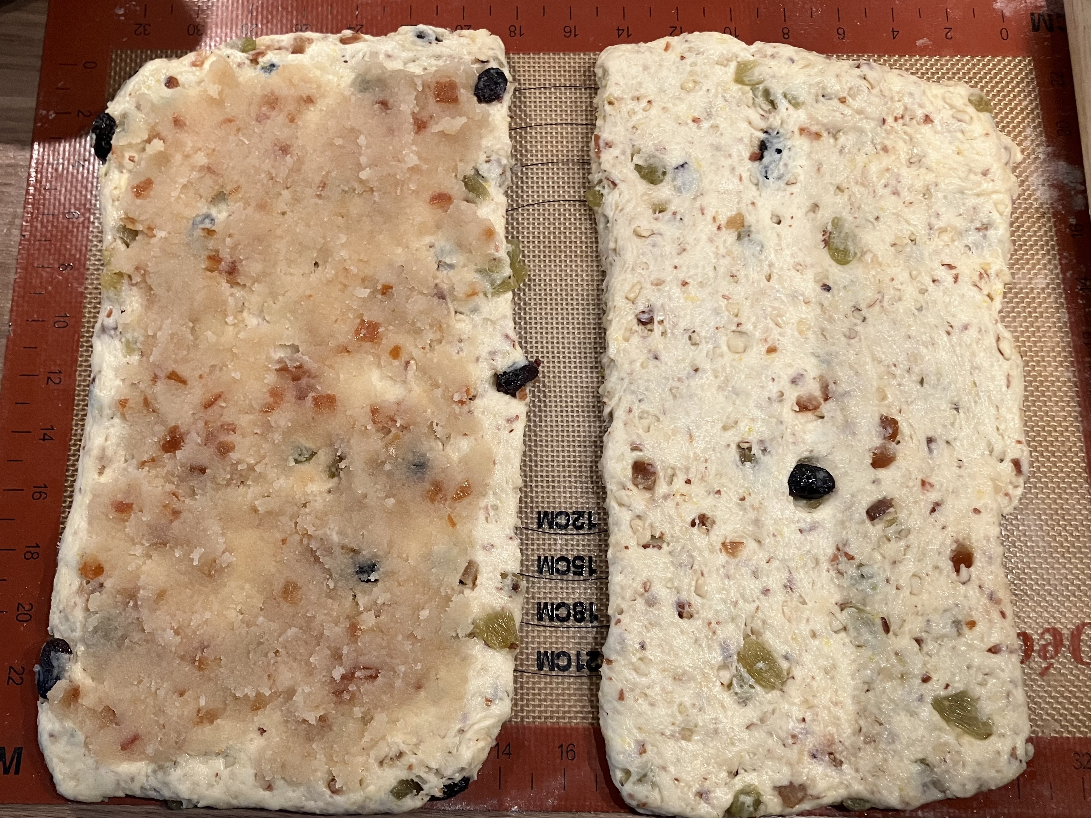 Das Rezept habe ich halbiert, ansonsten aber weitgehend so gelassen, wie Ulrike es in ihrer verbesserten Variante vorschlägt. Nur das Stollengewürz habe ich weggelassen. So sehr ich Marzipan mag, hassen es manche Familiemitglieder, also habe ich im zweiten Durchgang einen Teil mit einer Rosinen-Orangeat-Mischung gefüllt.