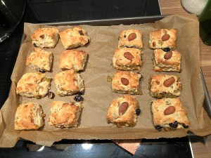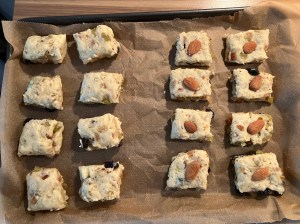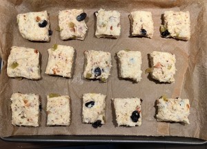 Die zweite Teighälfte darauflegen und etwas andrücken. Die Platte nun z.B. mit Hilfe einer Teigkarte in Quadrate von ca. 3×3 cm teilen und diese mit etwas Abstand zueinander auf ein Backblech setzen.