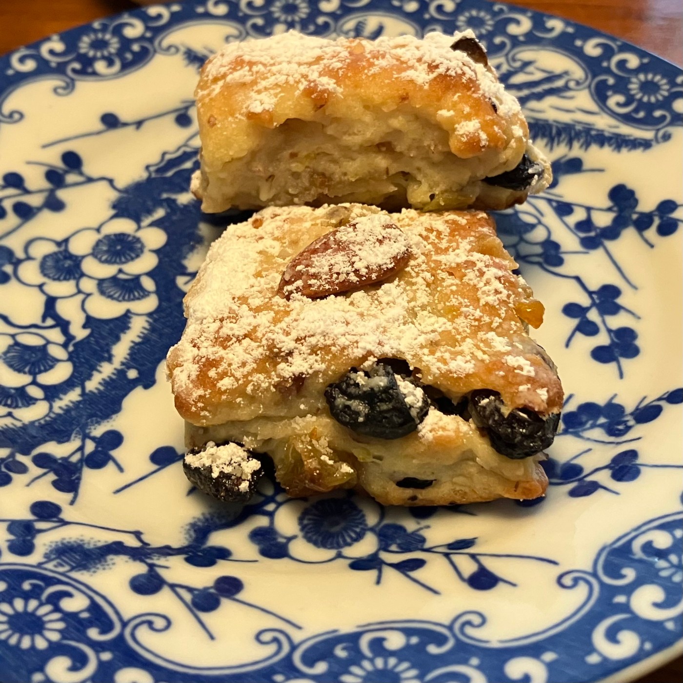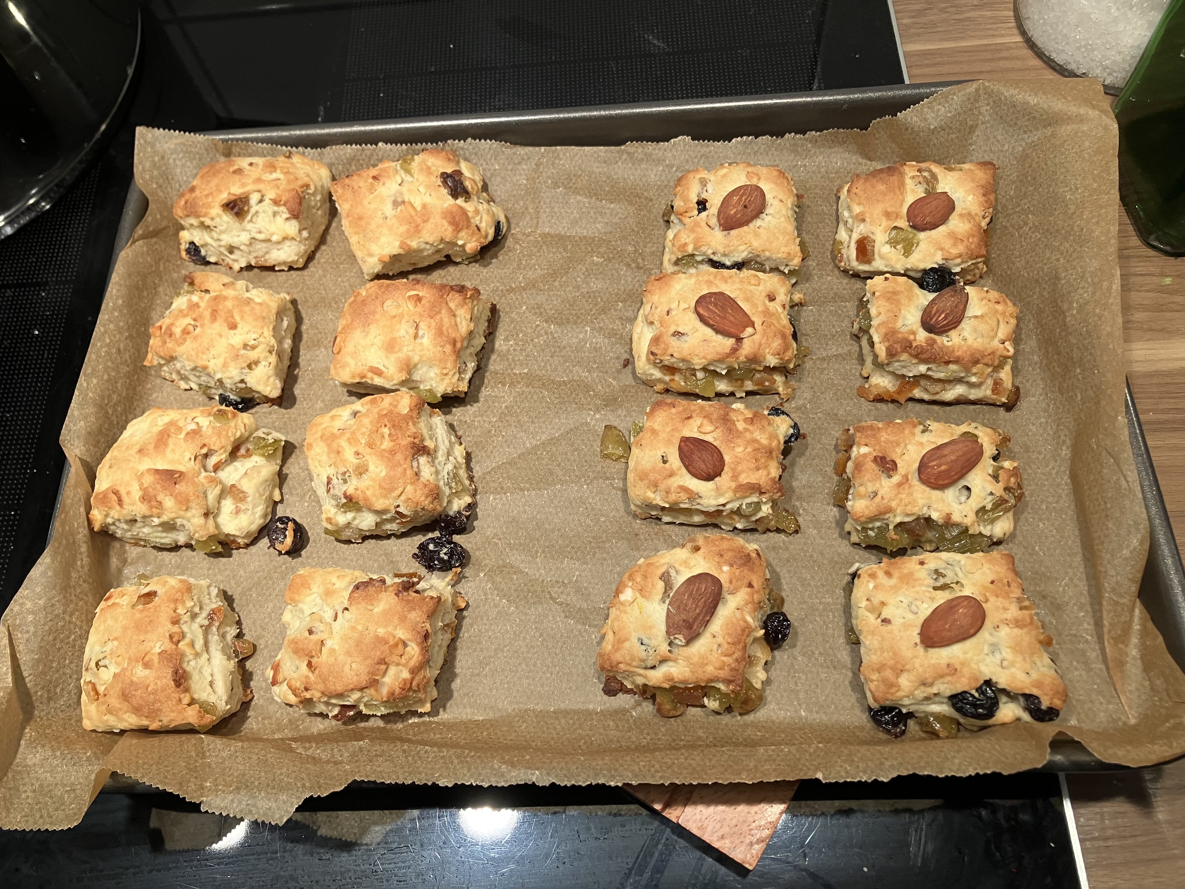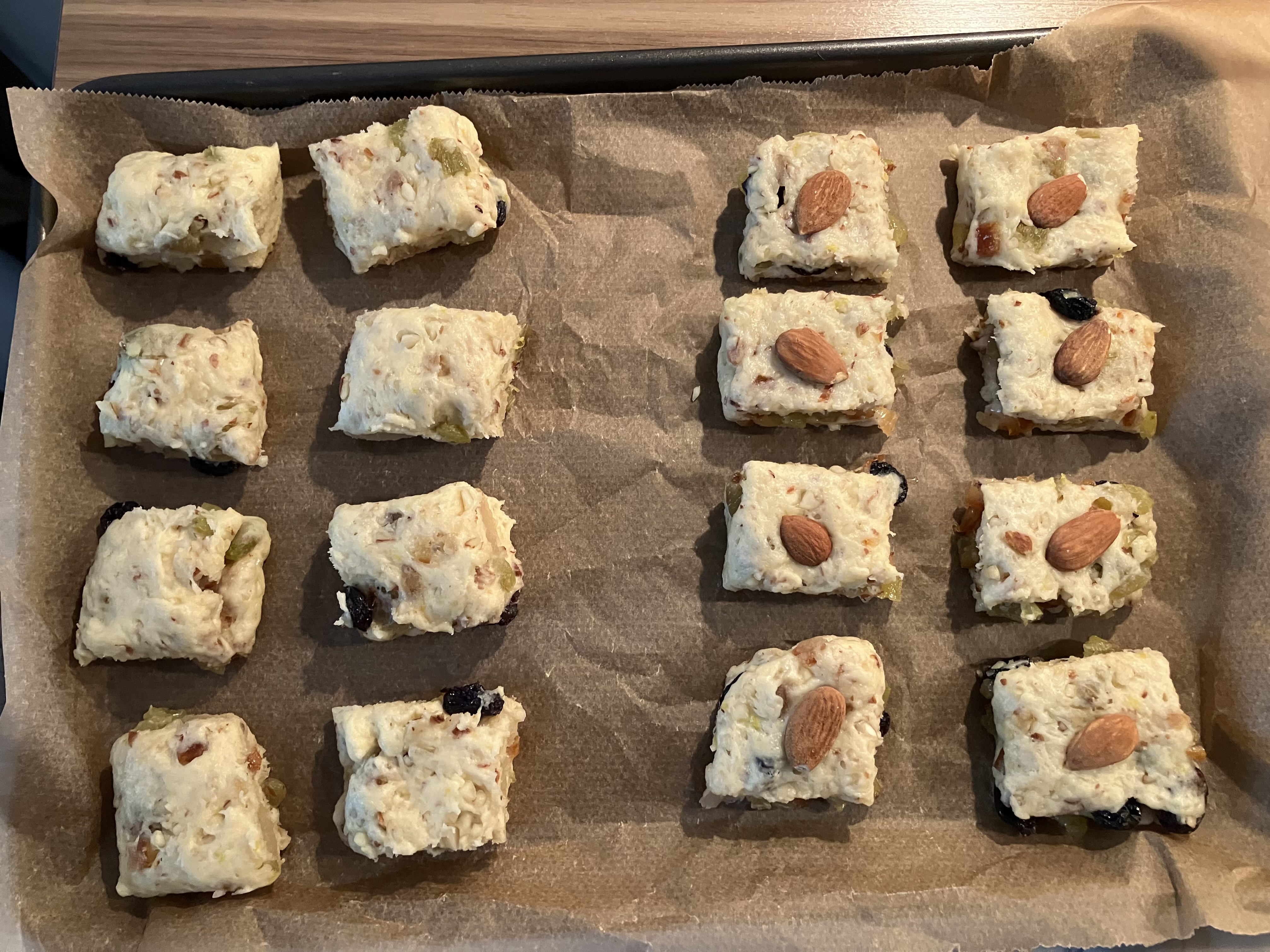 Am Morgen des Backtages die Rosinen aufteilen: ca. 3/4 der Menge wie oben beschrieben verarbeiten, 1/4 der Menge mit den zusätzlichen 20 g Orangeat vermischen. Den Teig zunächst zubereiten wie oben beschrieben. Nach dem Ruhen den Teig aufteilen: 1/4 beiseitelegen, 3/4 mit der Marzipanmischung füllen. Dann den restlichen Teig ausbreiten und mit der Rosinen-Orangeat-Mischung füllen. Dieses Konfekt ohne Marzipan jeweils mit einer ganzen Mandel versehen (oder eine andere sichtbare Markierung zur Unterscheidung der beiden Sorten verwenden).
