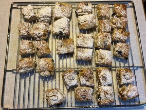 Die verbliebenen 75 g Butter schmelzen und damit das noch heiße Konfekt (mehrfach) gründlich einpinseln. Sobald die Butter eingezogen ist, das Konfekt mit Puderzucker bestäuben. Auf einem Gitter vollständig erkalten lassen.