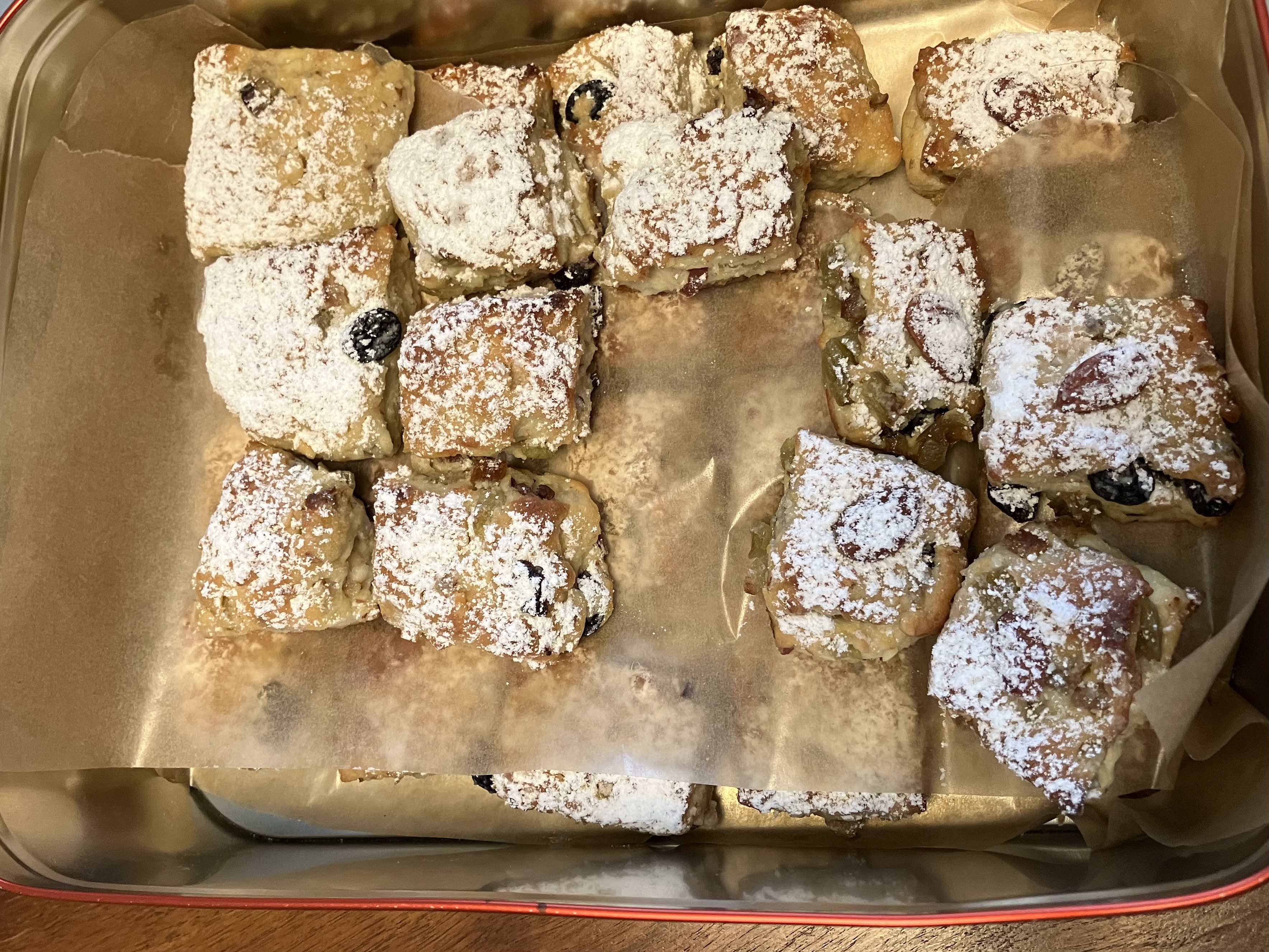 Im Gegensatz zum regulären Stollen muss dieses Stollenkonfekt vor dem Verzehr nicht lange gelagert werden, es ist bereits am Backtag sehr lecker und erreicht geschmacklich nach 2-3 Tagen seinen Höhepunkt.